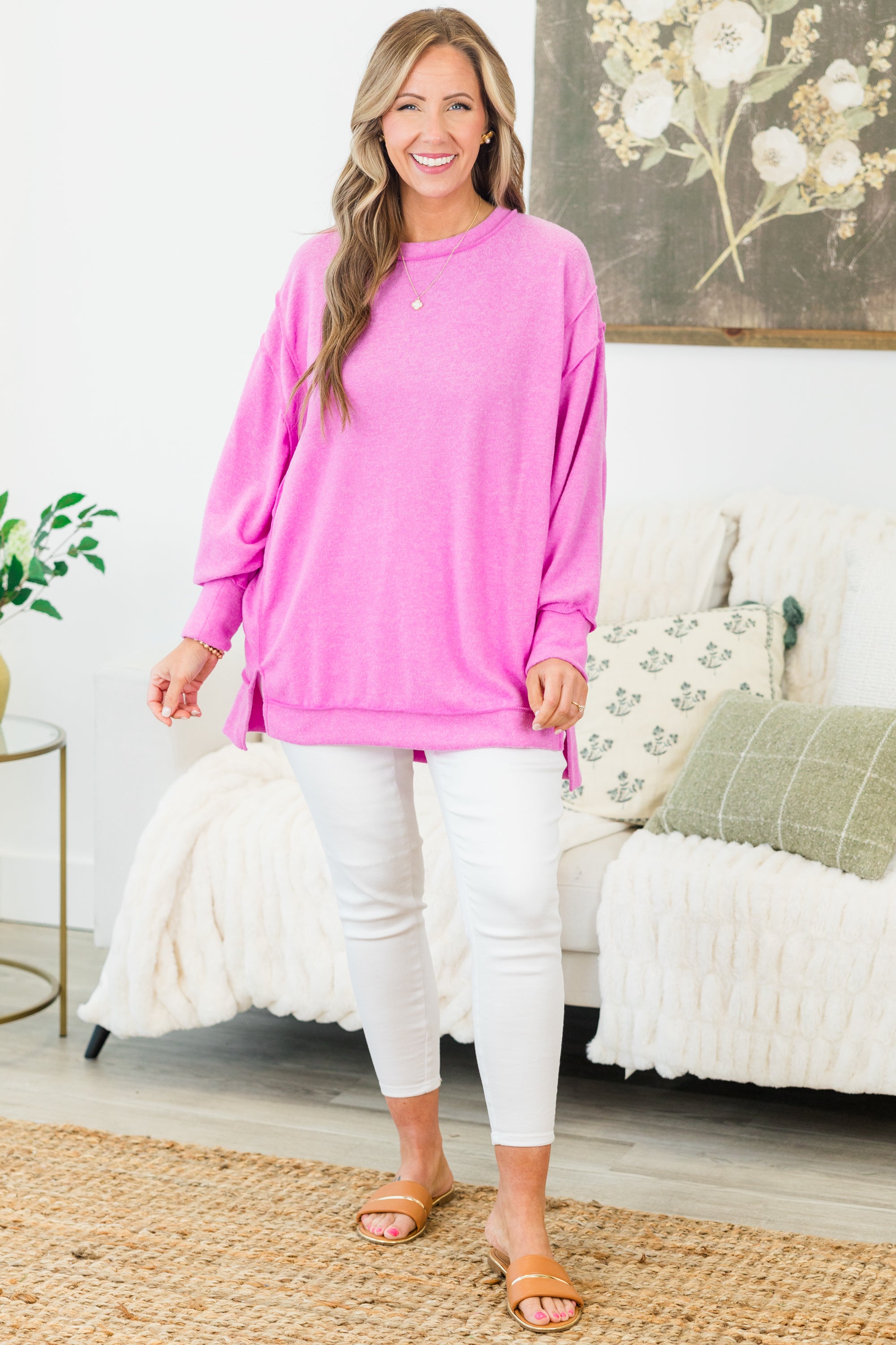 Get ready to say hello to your new favorite sweater! This bright mauve top features playful exposed seam detailing and butter soft brushed material! Perfectly paired with your favorite denim and booties! Hello comfort, hello style!