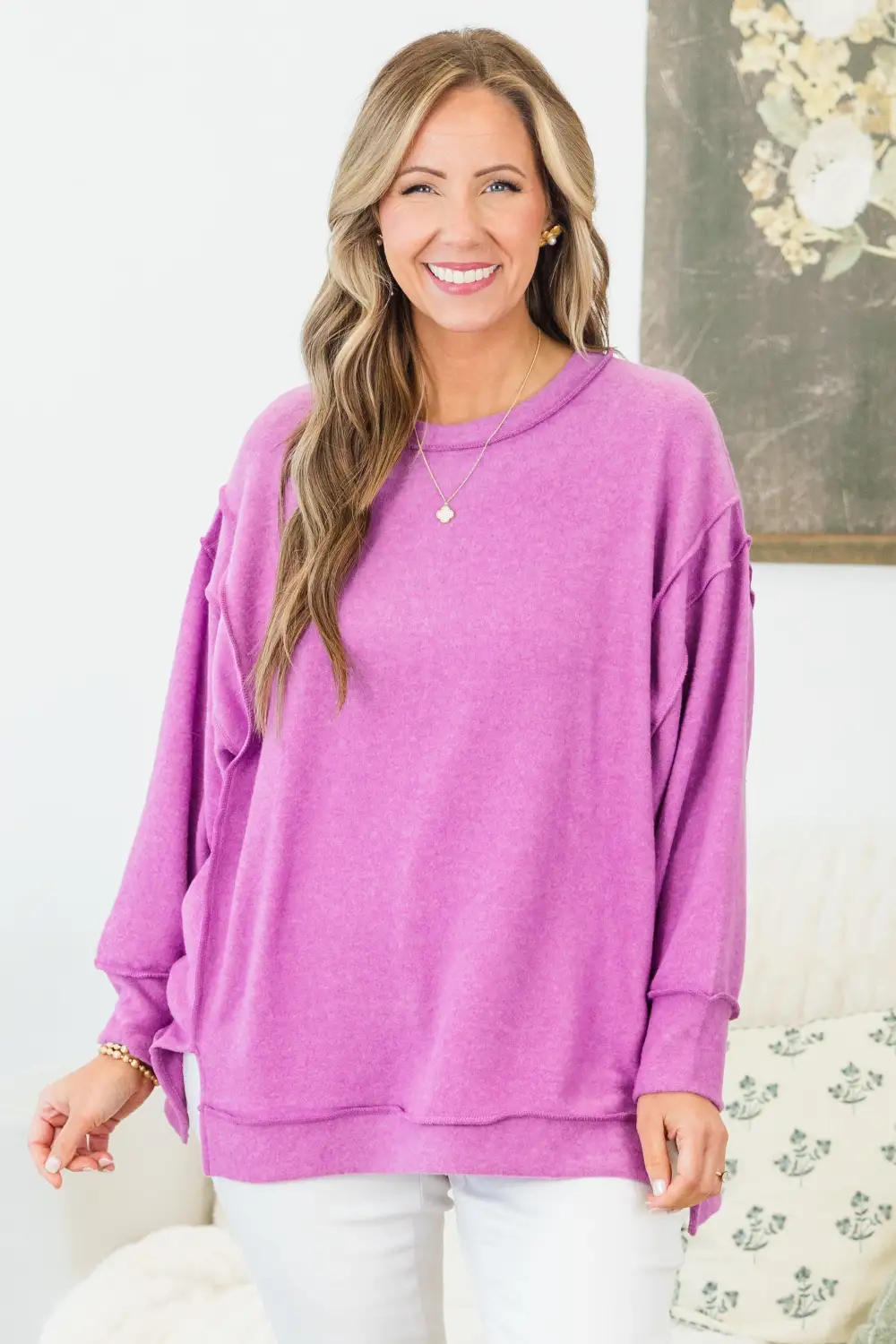 Get ready to say hello to your new favorite sweater! This bright violet top features playful exposed seam detailing and butter soft brushed material! Perfectly paired with your favorite denim and booties! Hello comfort, hello style!