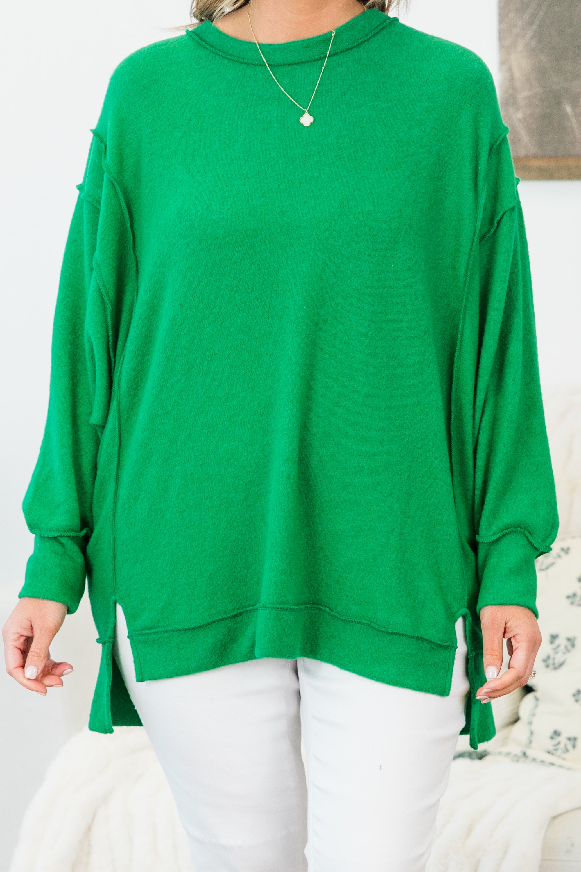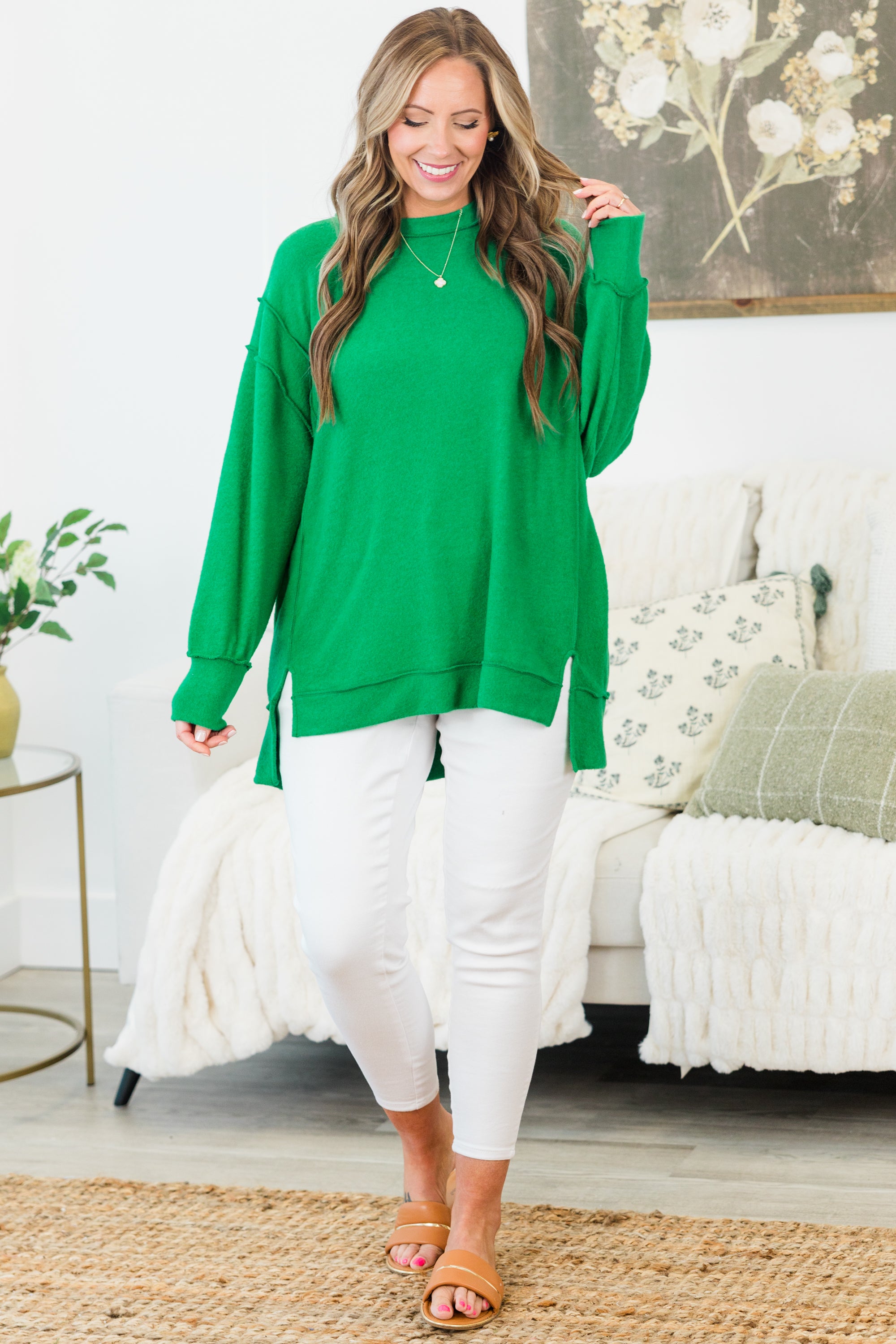 Get ready to say hello to your new favorite sweater! This kelly green top features playful exposed seam detailing and butter soft brushed material! Perfectly paired with your favorite denim and booties! Hello comfort, hello style!