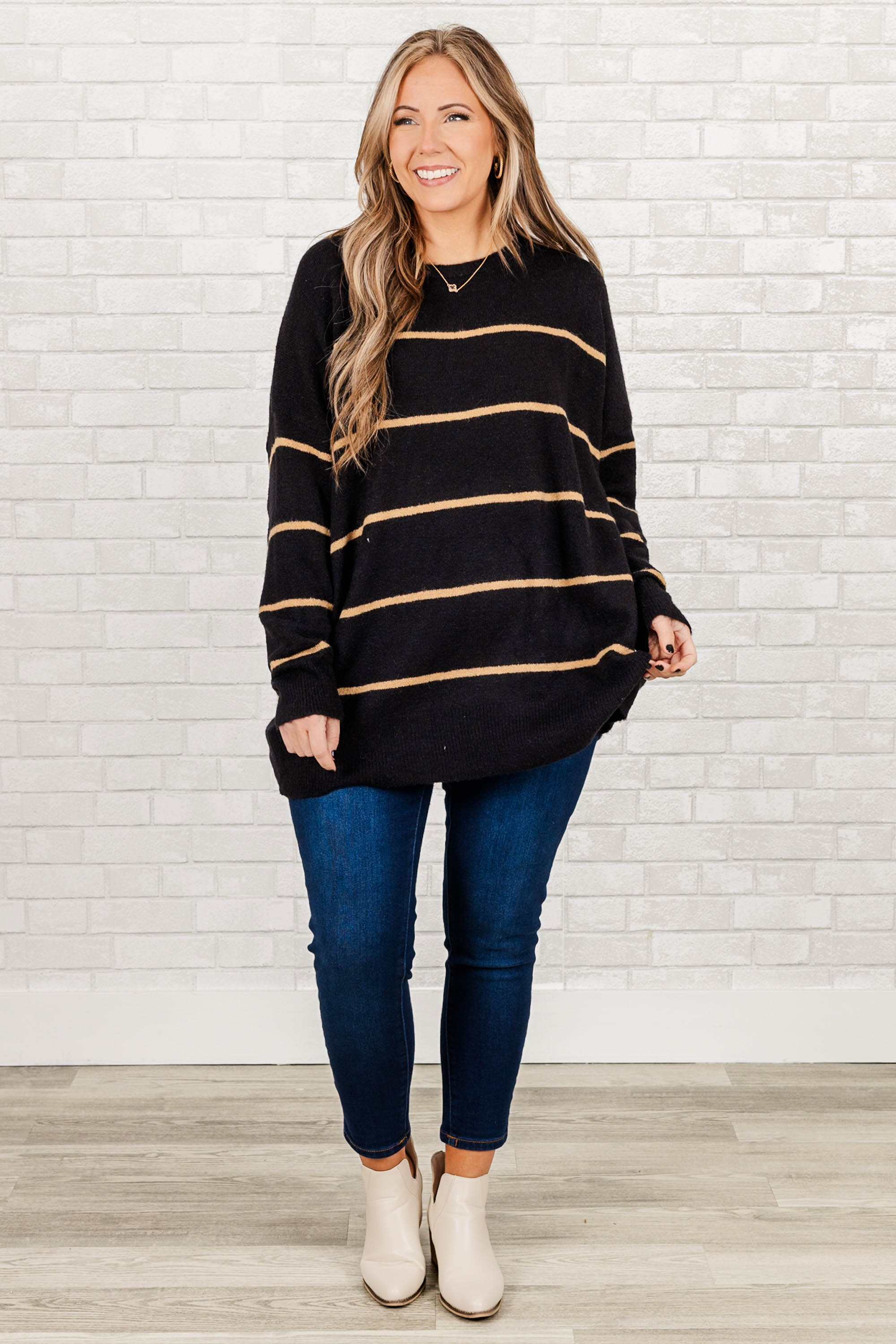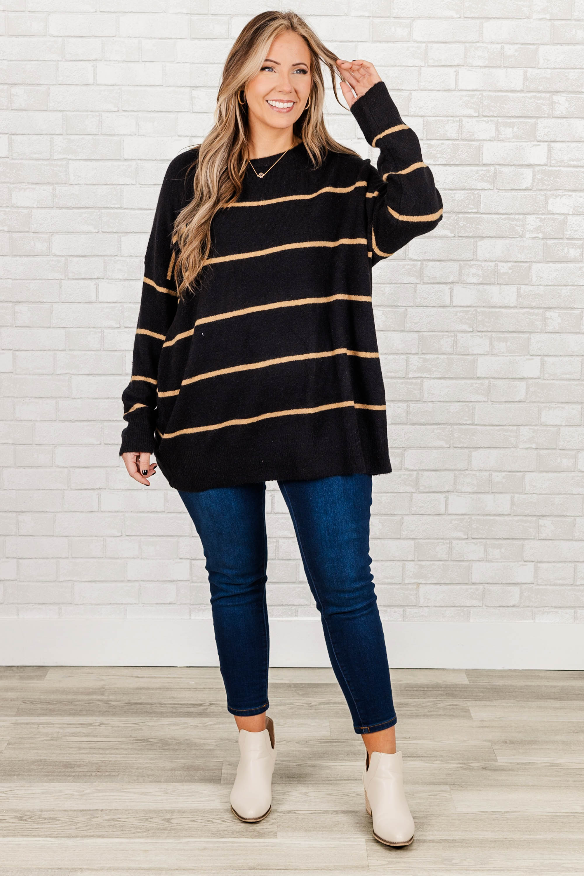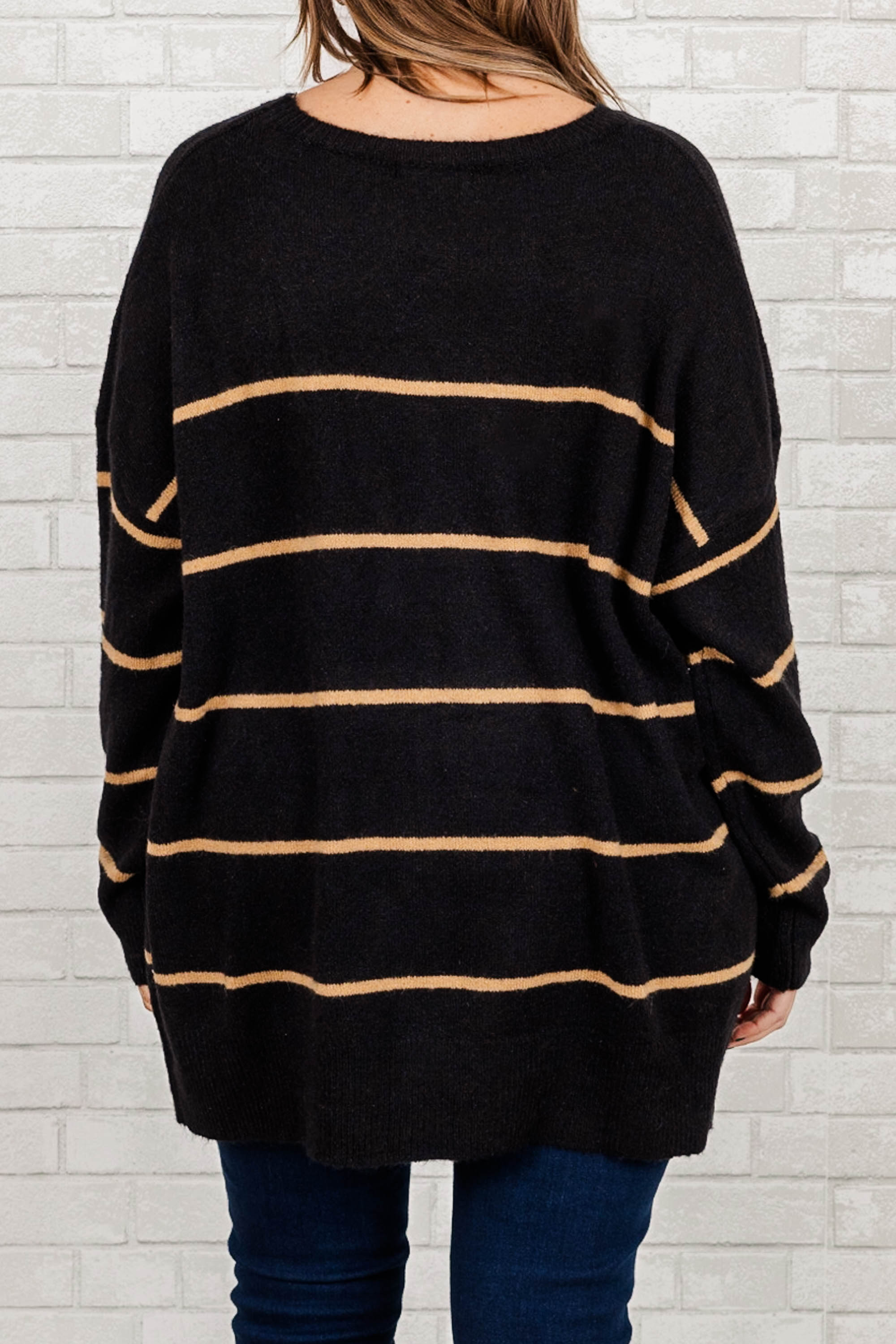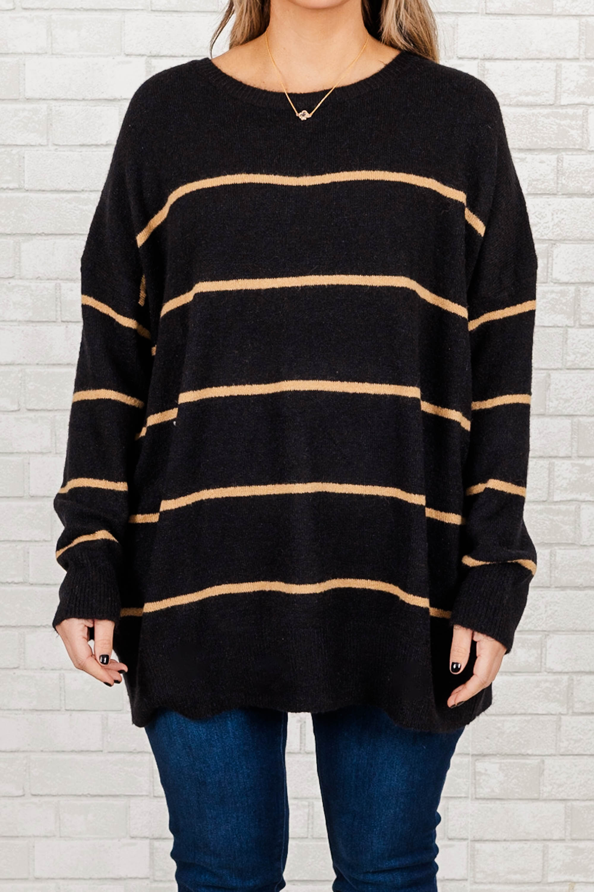 We wanna snuggle up and have a fun night with friends in this sweater! It has a cute black-brown stripe pattern, relaxed fit and the softest fabric! It's great for keeping warm on cold days and nights! Pair it with skinnies and booties for an easy, stylish outfit!