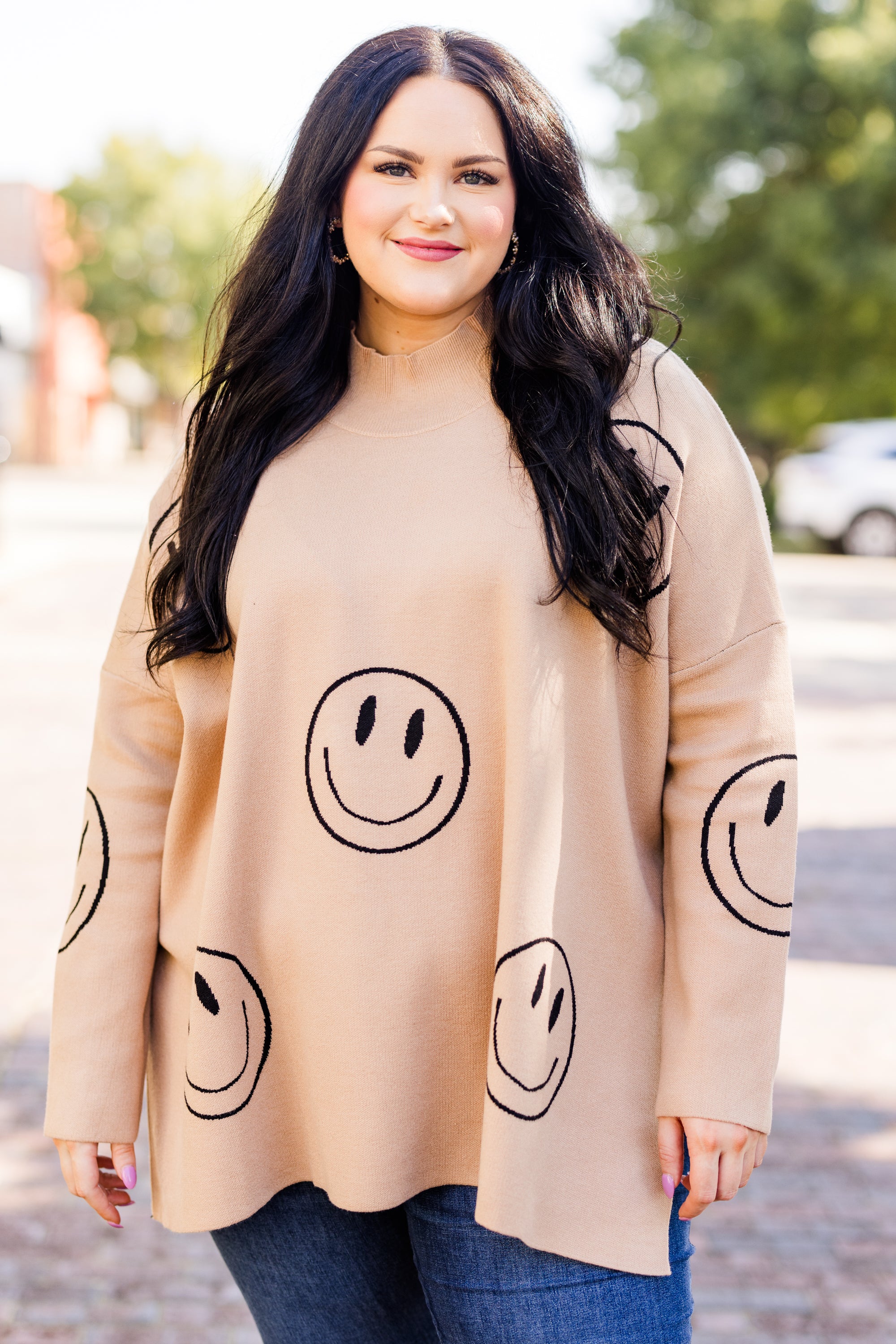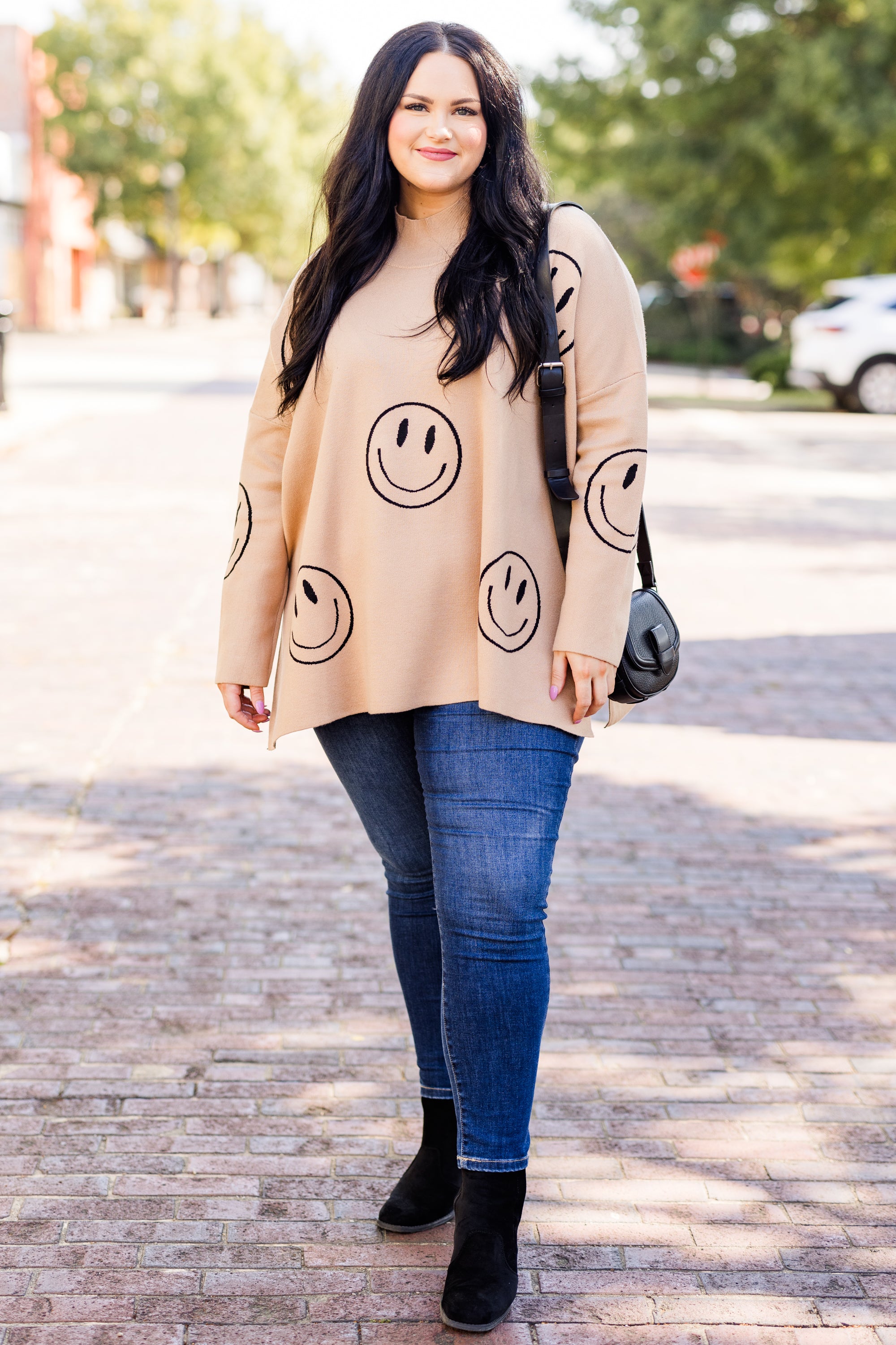 This sweater is sure to make you smile! It is perfect for cold days ahead! Its adorable smiley graphic and lovely mocha color will keep you feeling comfy and stylish! Wear it with skinnies or leggings for a casual chic look!