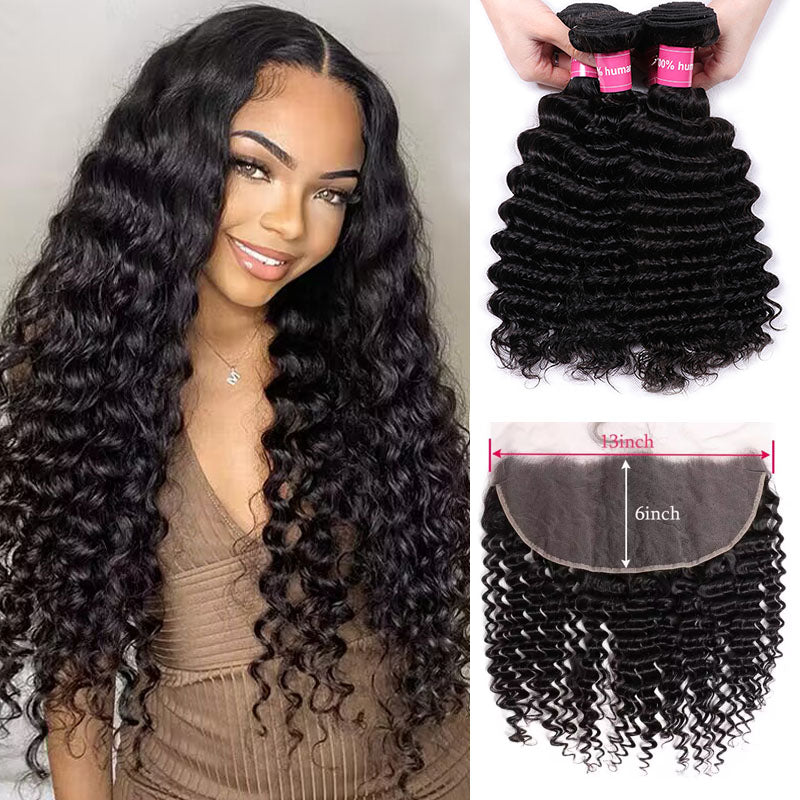 • Sterly Deep Wave Bundles With 13X6 Lace Frontal Human Hair Bundles With Frontal