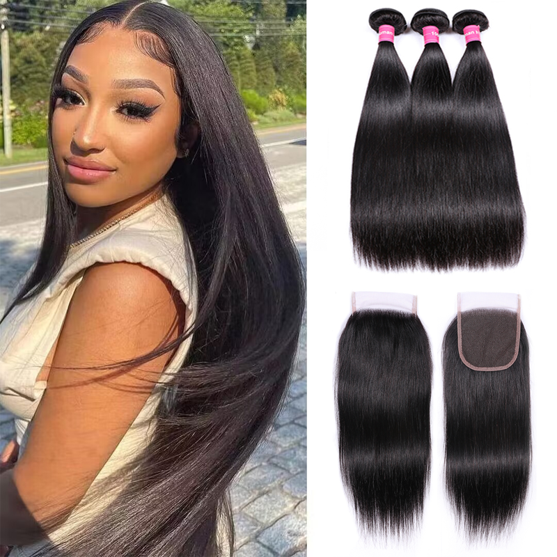• Sterly Raw Hair Straight Human Hair Weave 3 Bundles With 4×4 Lace Closure
