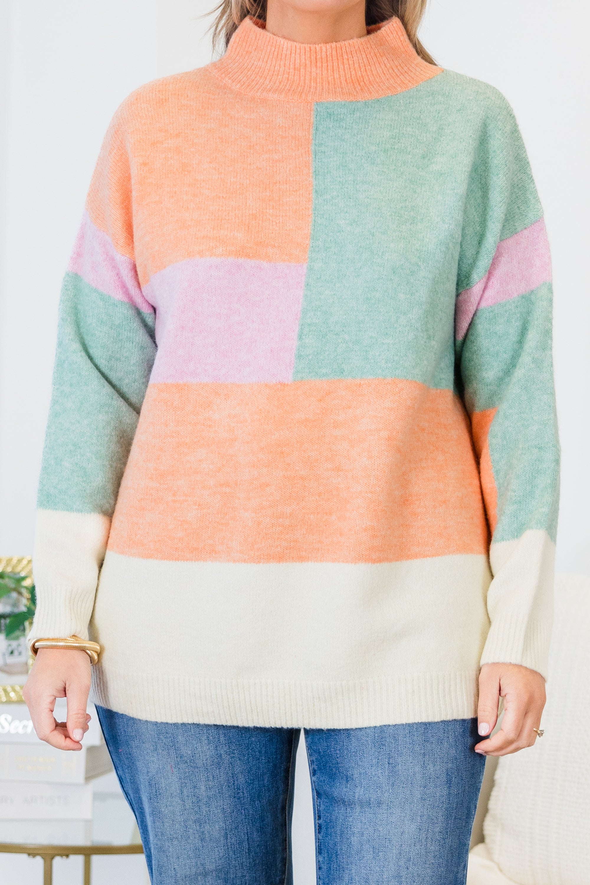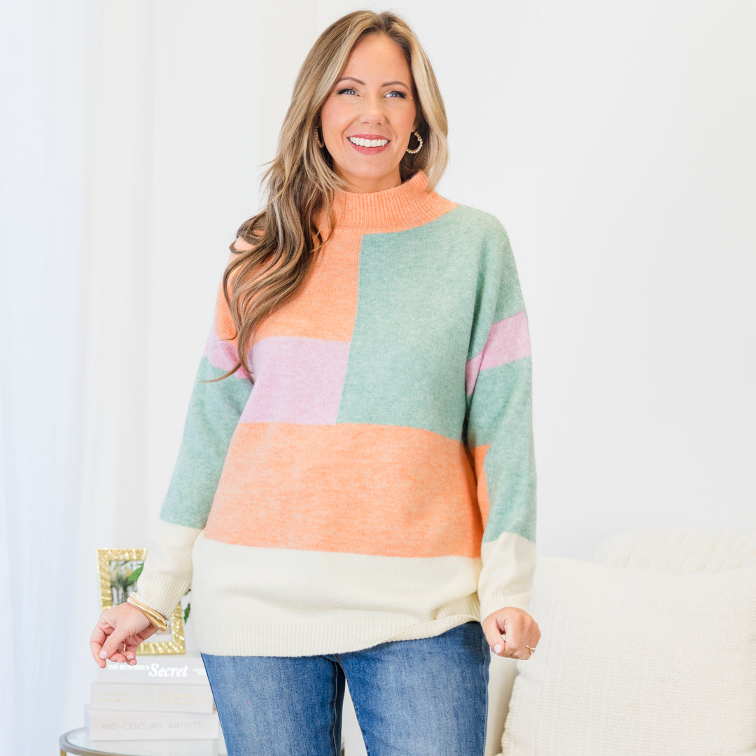 Wrap yourself in style and comfort with this sweater! This multi-colored, colorblock mock neck sweater features a ribbed hemline, neck, and cuffs for a fashionable and cozy fit! Elevate your wardrobe with this must-have piece and make every moment count!