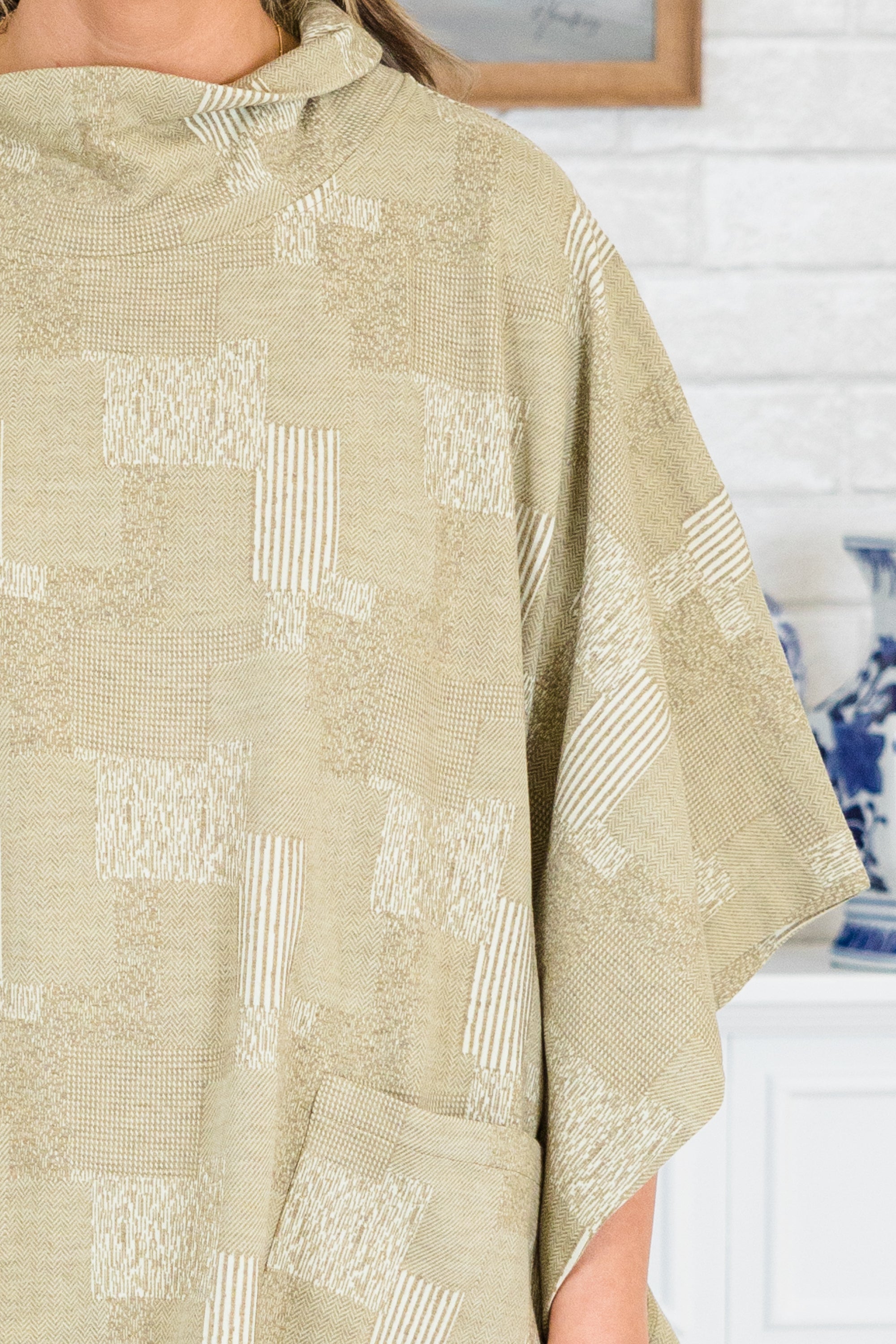 Get cozy in our Sweater Weather Poncho! This taupe poncho features a high mock neck and front pockets for ultimate warmth and comfort! The abstract print adds a touch of uniqueness to this must-have winter piece! Get ready to rock your winter wardrobe in style!