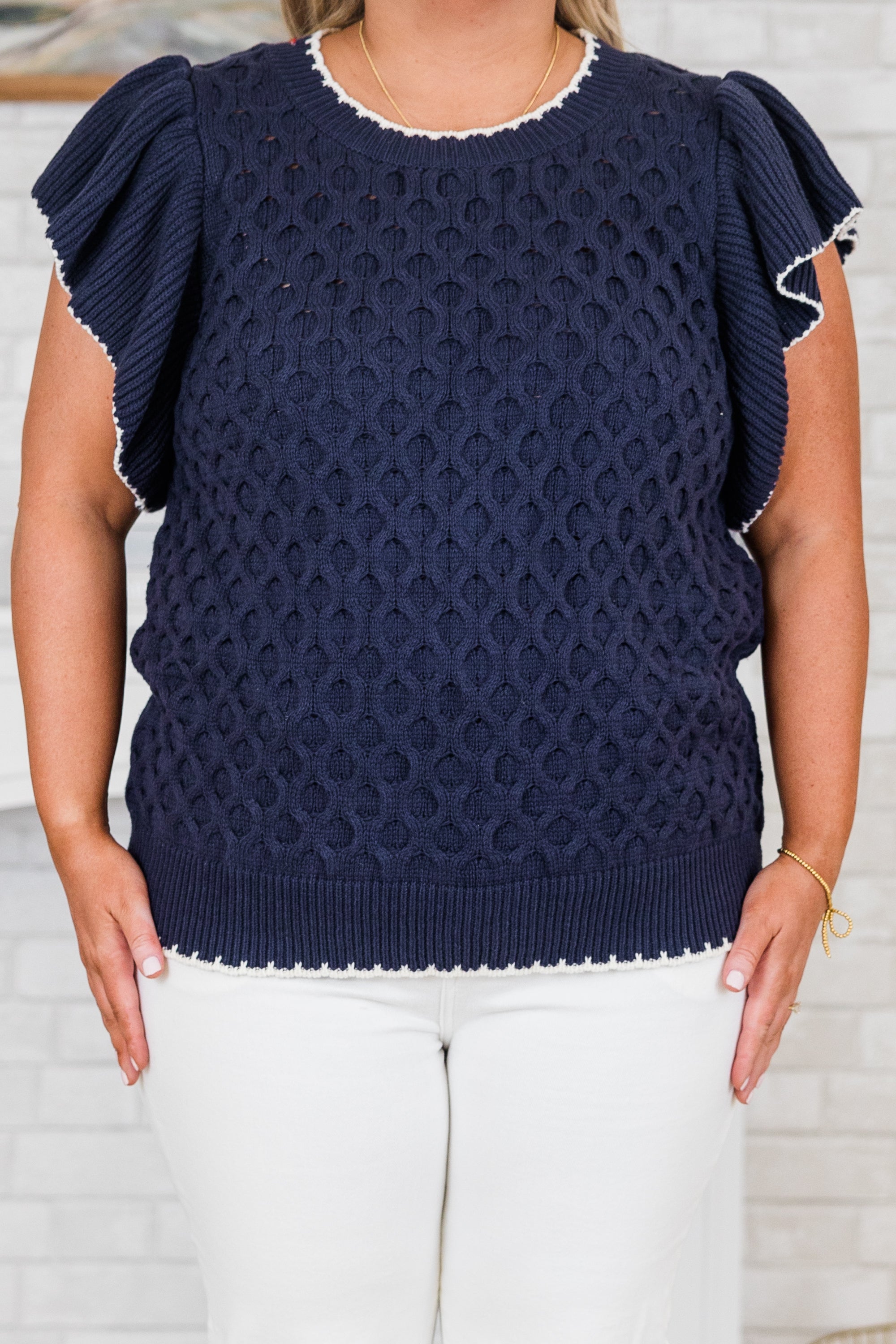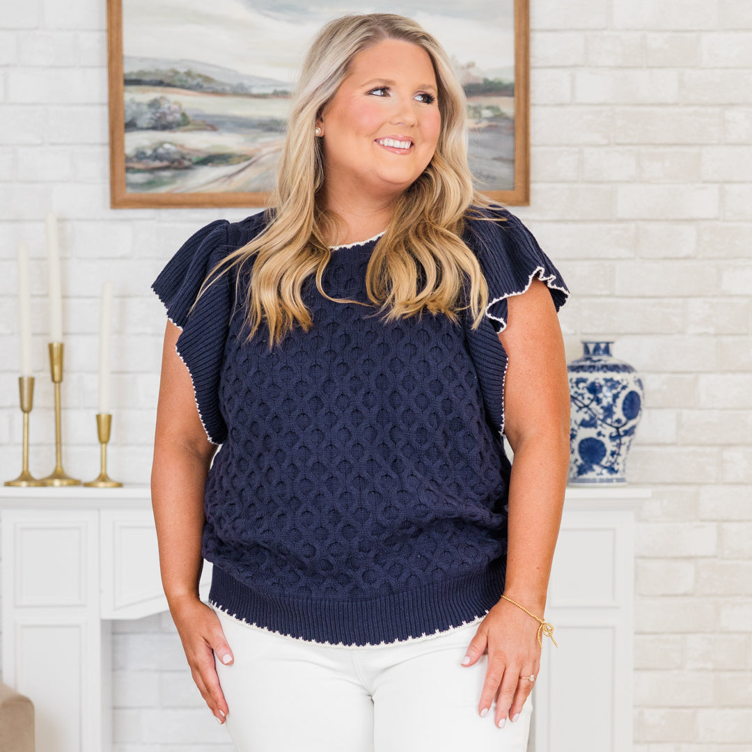 Breathe in the cozy comfort of this sweater in navy! The textured knit and flutter sleeves add a touch of femininity, while the white border on the neckline, hemline, and sleeves provide a polished finish! Stay warm and stylish in this stunning sweater!