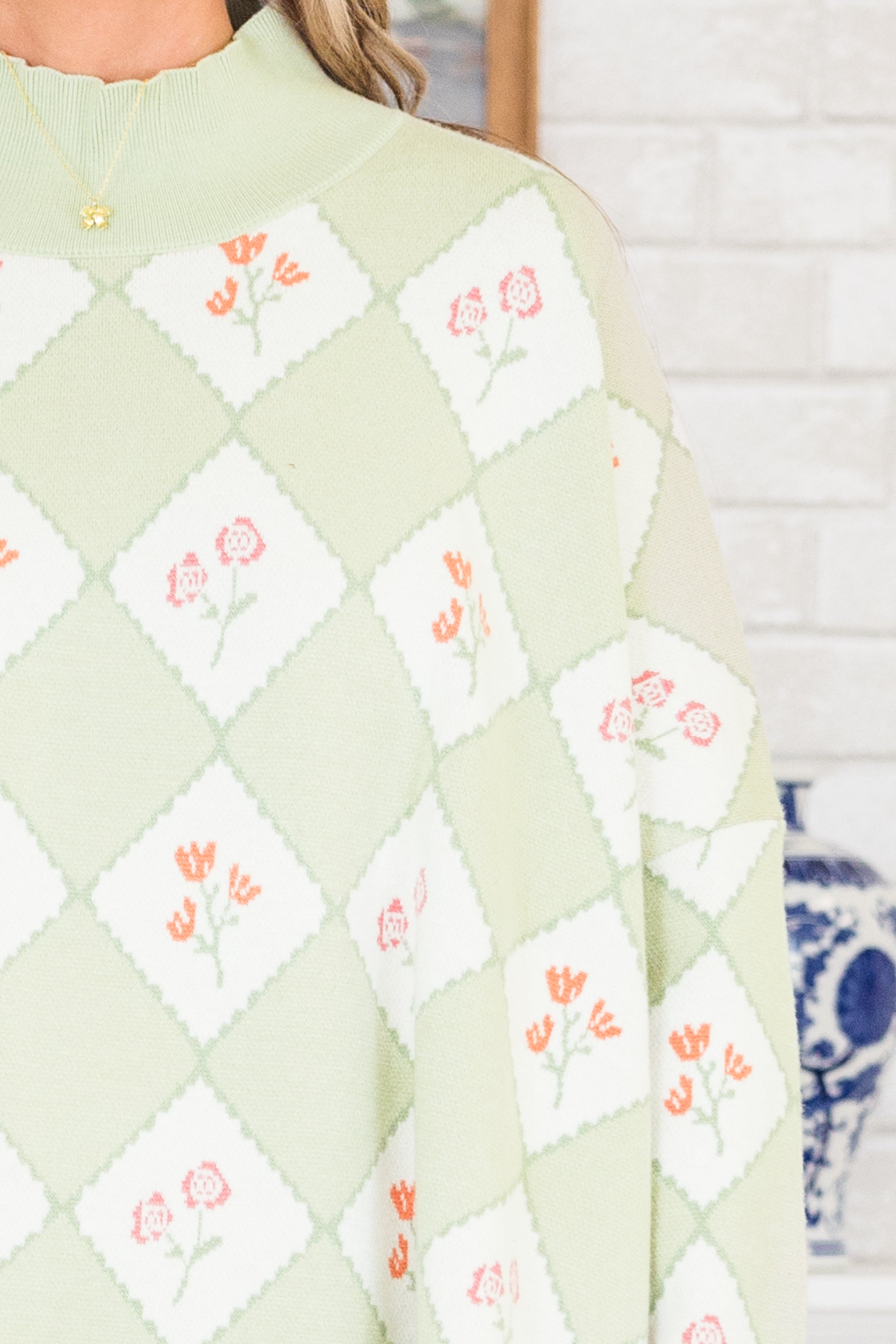 Transform your wardrobe with our Taste Of Treasure Sweater in sage color! Featuring a stunning floral argyle design, this sweater is both stylish and cozy! A mock neckline, side slits, and long fitted sleeves with drop shoulders add an extra touch of elegance! Elevate your look and stay warm all season long!