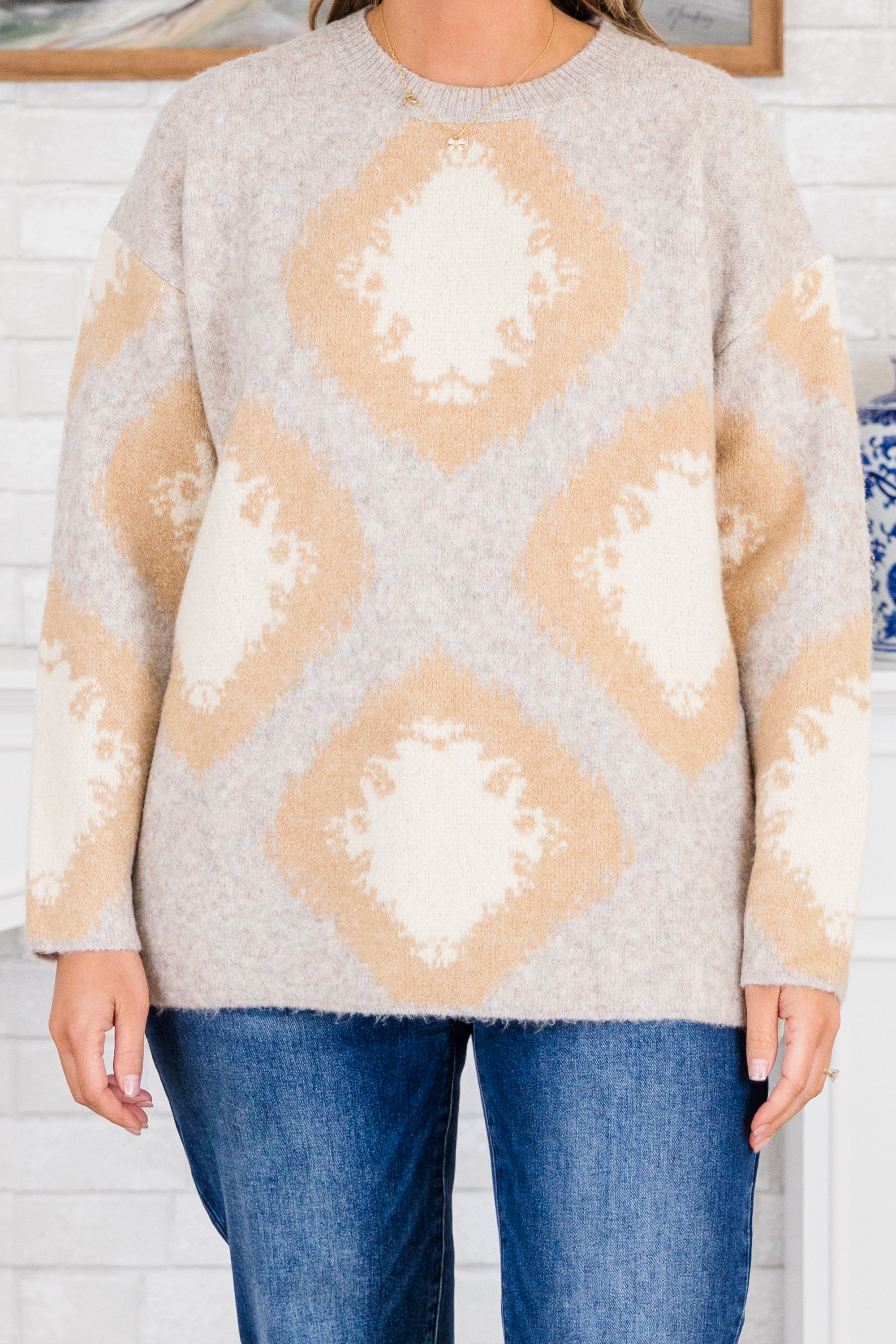 Introducing the Serene Sweater in Gray, the epitome of comfort and style! This long-sleeve sweater features a classic crew-neckline and a subtle tan diamond pattern, adding a touch of sophistication! Stay cozy and chic in this sweater!
