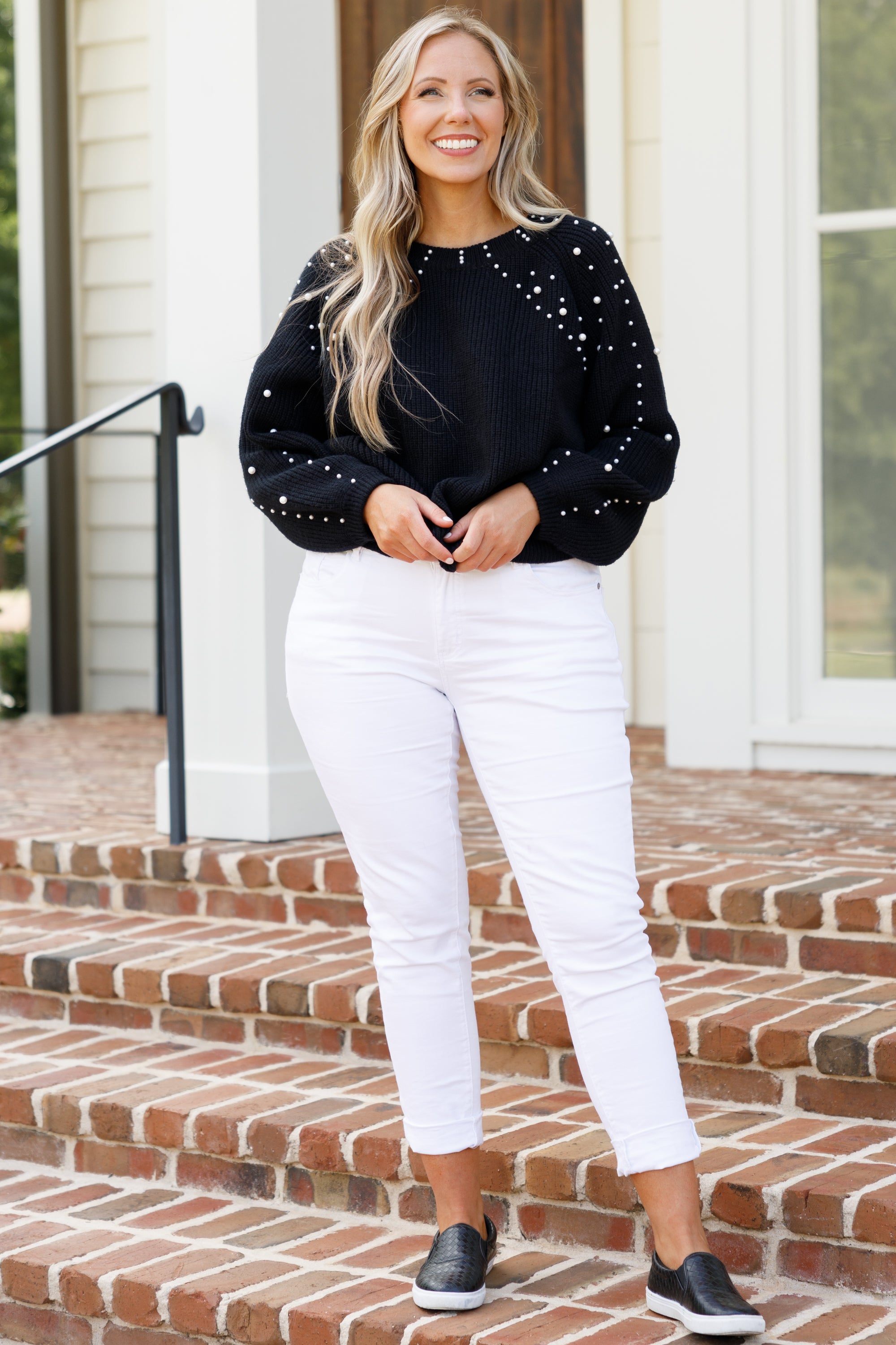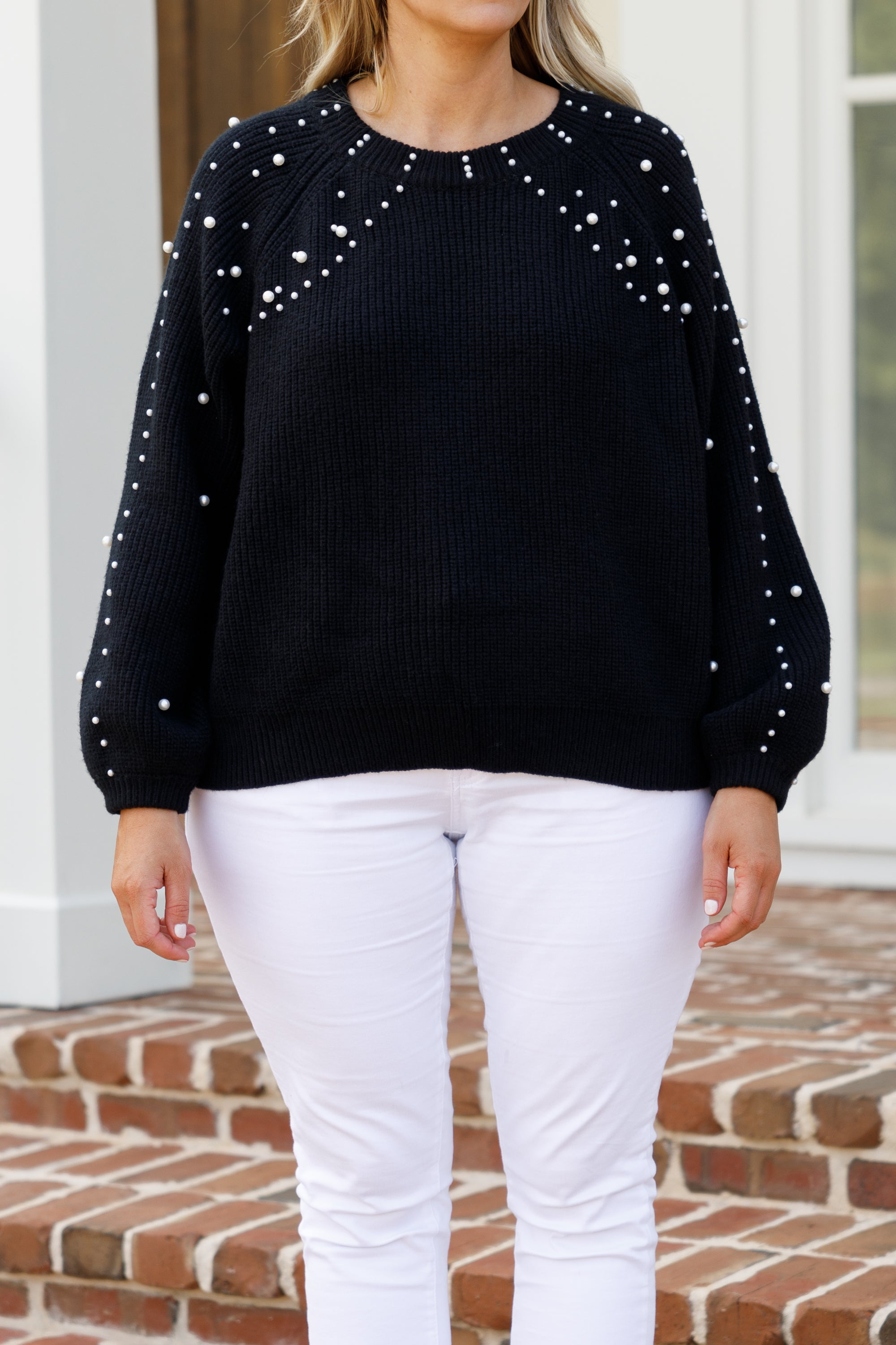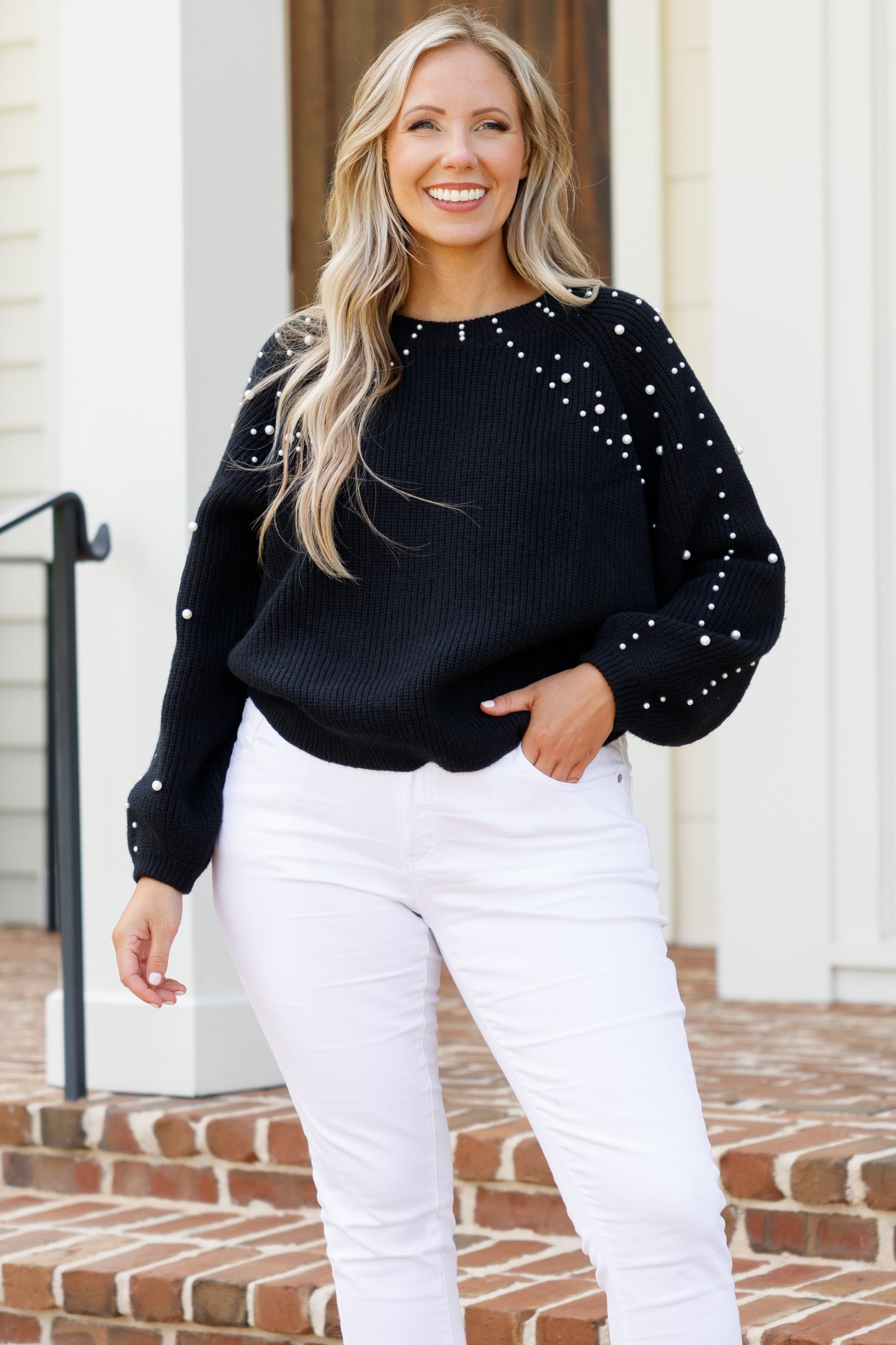 This sweater is perfect for everyday wear! It features a classic black color, pearl detailing, and a flattering fit that is sure to make you look and feel great! Crafted with utmost comfort in mind, the cozy fabric will make you never want to take it off!