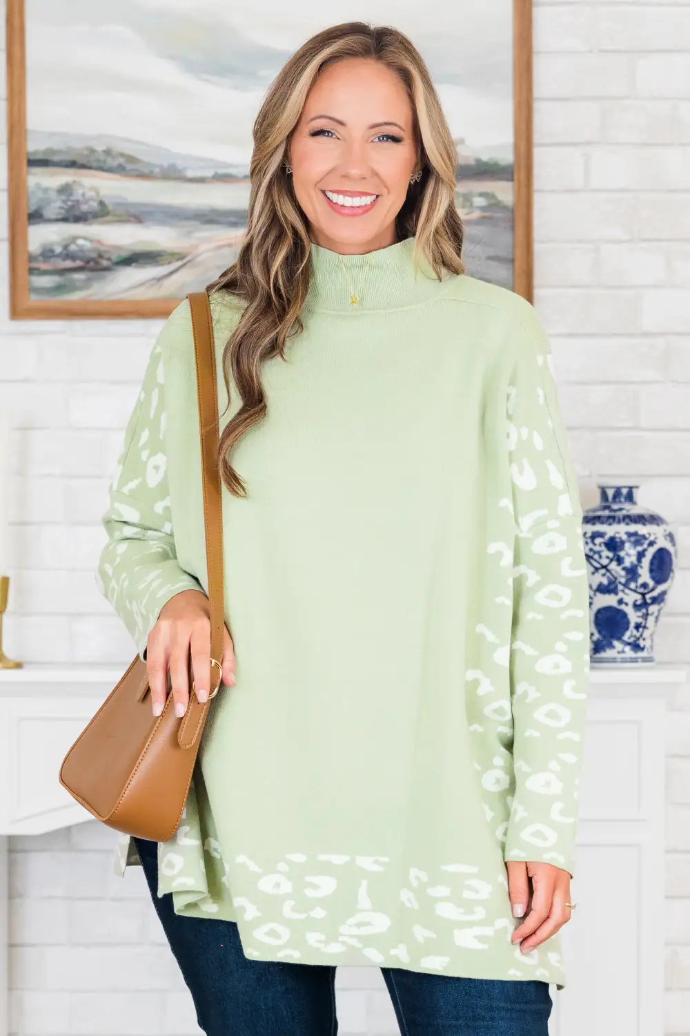 Walk away from the site with with this cutie on the way! The classic sage color and trendy leopard pattern is perfect for the season! The comfy, figure flattering fit is super cute and comfy! Style this sweater with some skinnies and booties for a casual chic look!