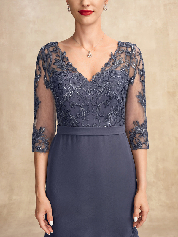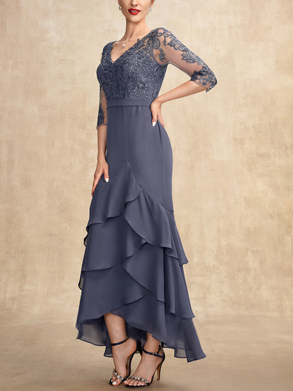 V Neck Asymmetric Chiffon Lace Maxi Dress