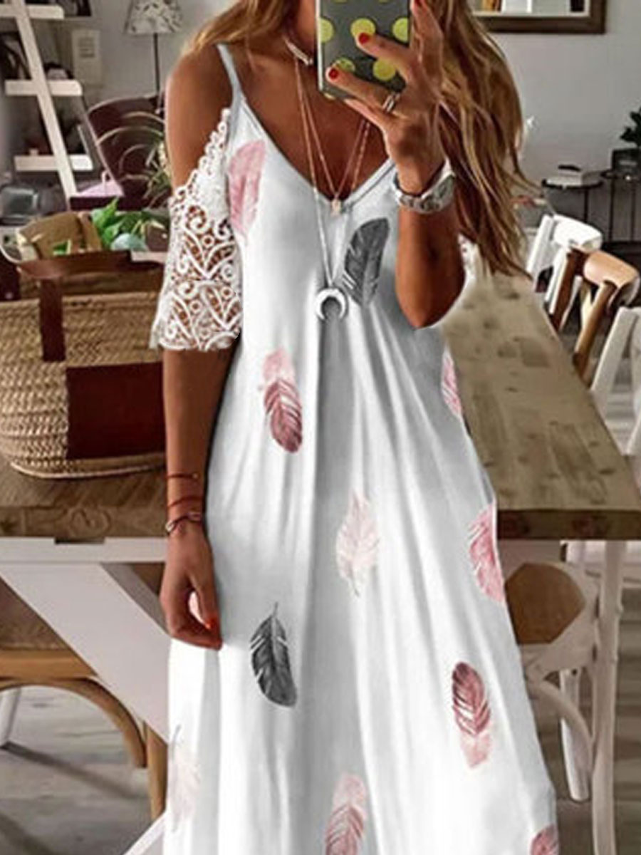 V-neck Casual Loose Feather Print Lace Panel Maxi Dress