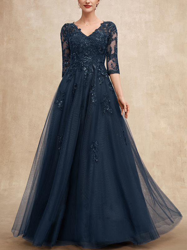 V-Neck Floor Length Tulle Lace Sequined Bridal Gown