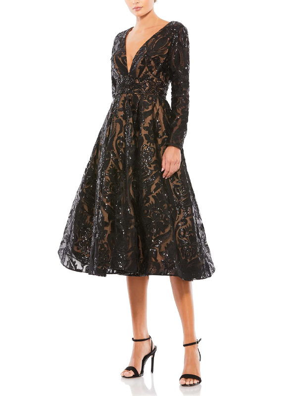 V Neck Long Sleeve Lace Midi Dress