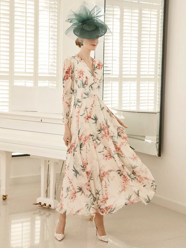 V Neck Long Sleeve Printed Maxi Dress