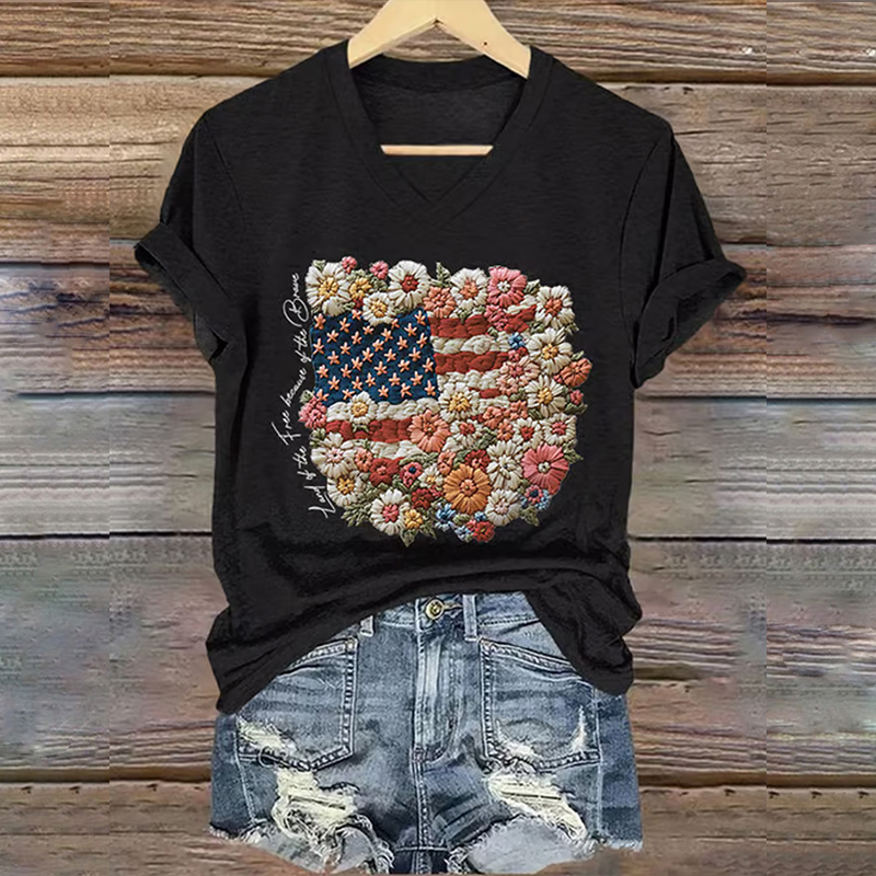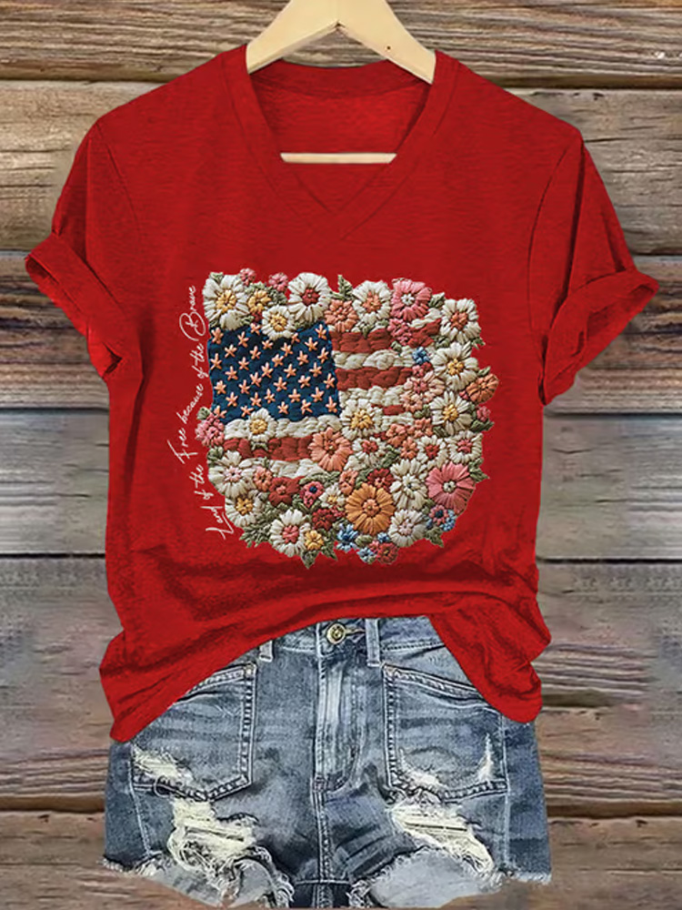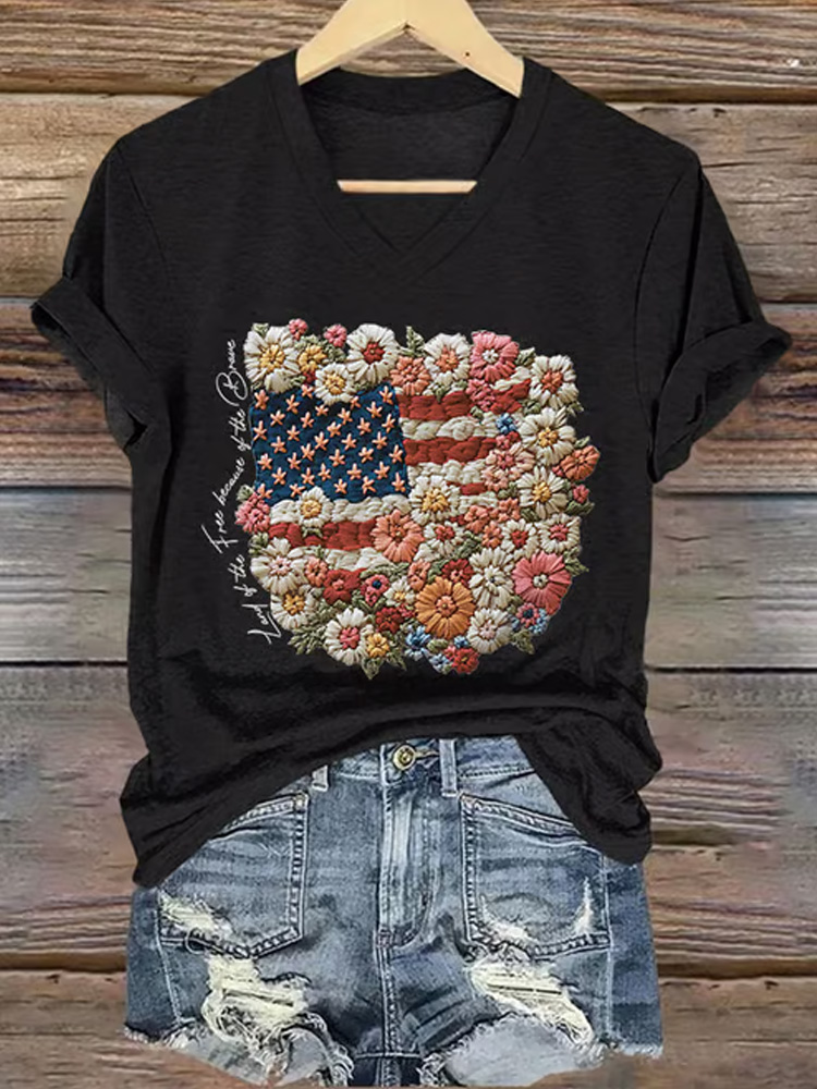V-neck Retro Independence Day Flowers Because Of The Brave Print T-shirt