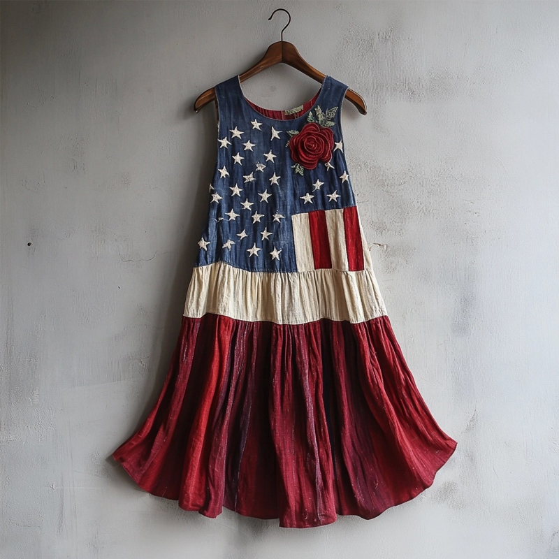 Vintage American Flag Inspired Rose Embroidered Linen Tank Dress