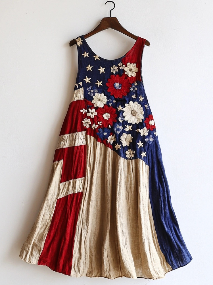 Vintage Flag Inspired Flowers Embroidered Linen Tank Dress