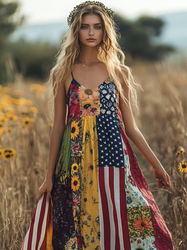 Vintage Floral American Flag Element Print Women's Linen Slip Dress