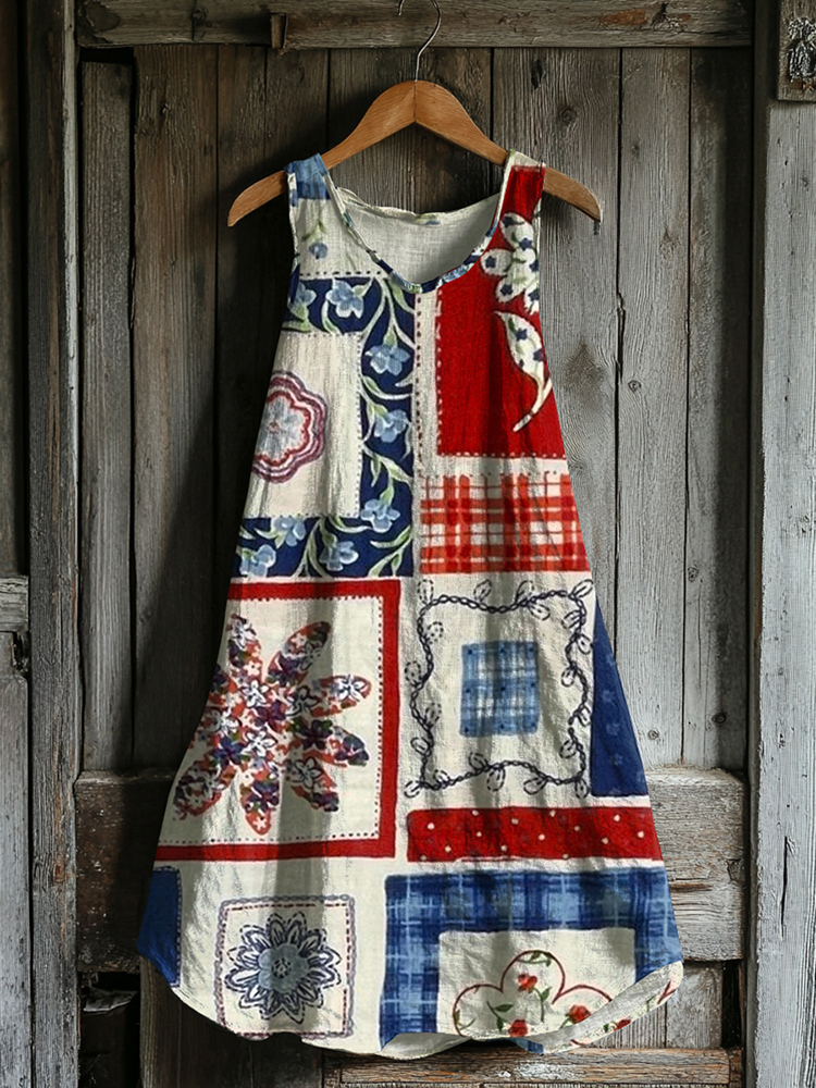 Vintage Independence Day American Geometry Floral Linen Tank Dress