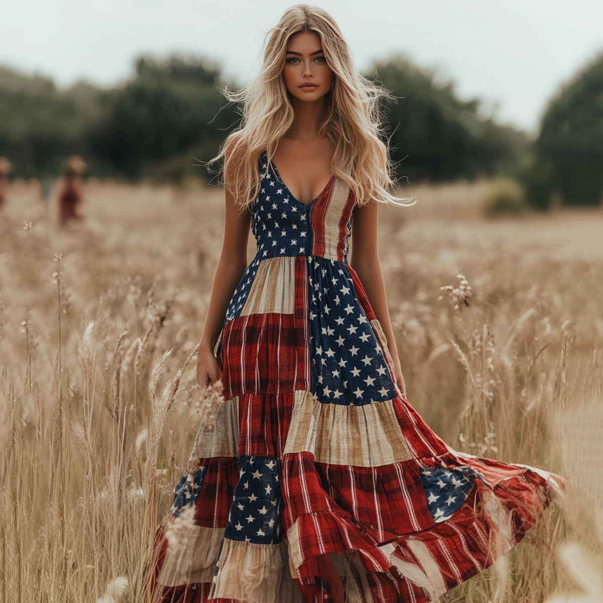Vintage Independence Day Patchwork America Flag Print Linen Tank Maxi Dress