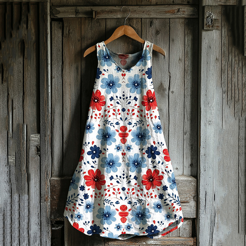 Vintage Loose Independence Day American Floral Patriotic Fourth Of July Art Linen Tank Dress