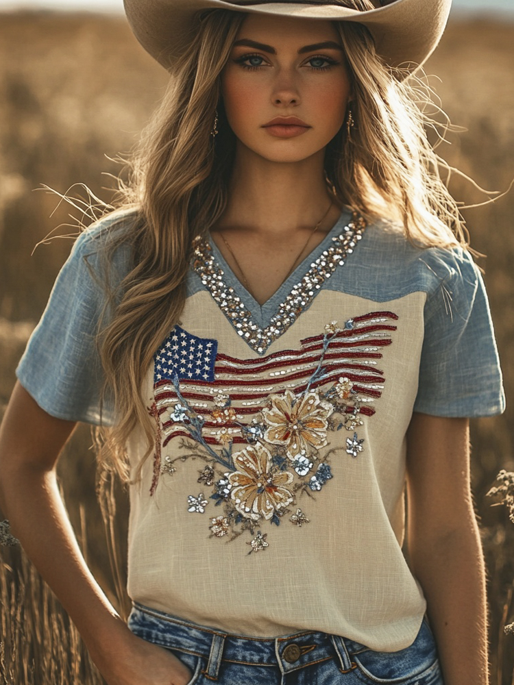 Vintage Sequin Floral Independence Day Women's V-neck T-shirt