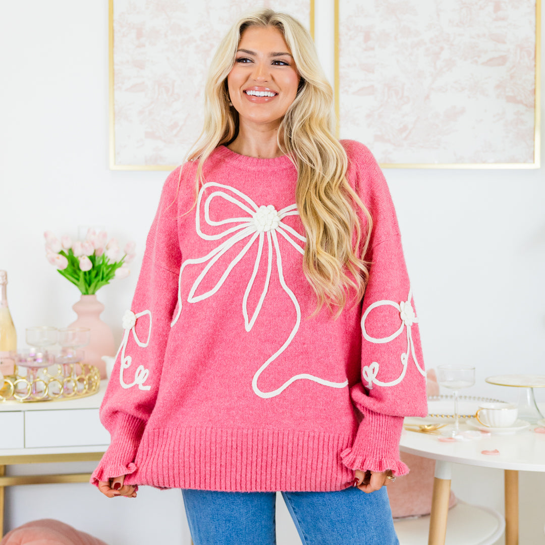 Get ready to strut your stuff in this sweater! Featuring a delicate corded bow pattern, drop sleeves, and a rounded neck, this butter soft sweater will keep you looking and feeling fabulous! Perfect for any season, it's the sweetest addition to your wardrobe!