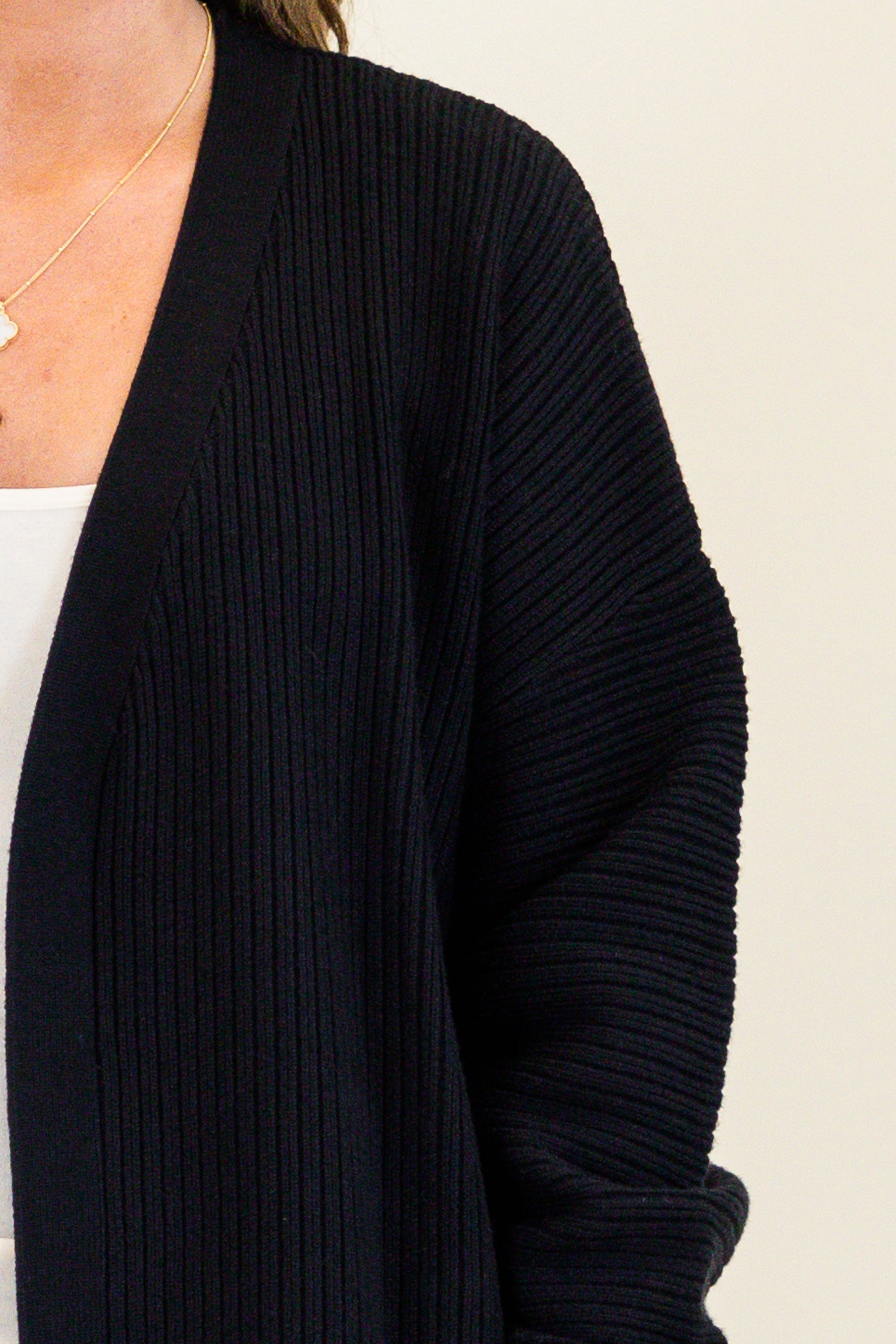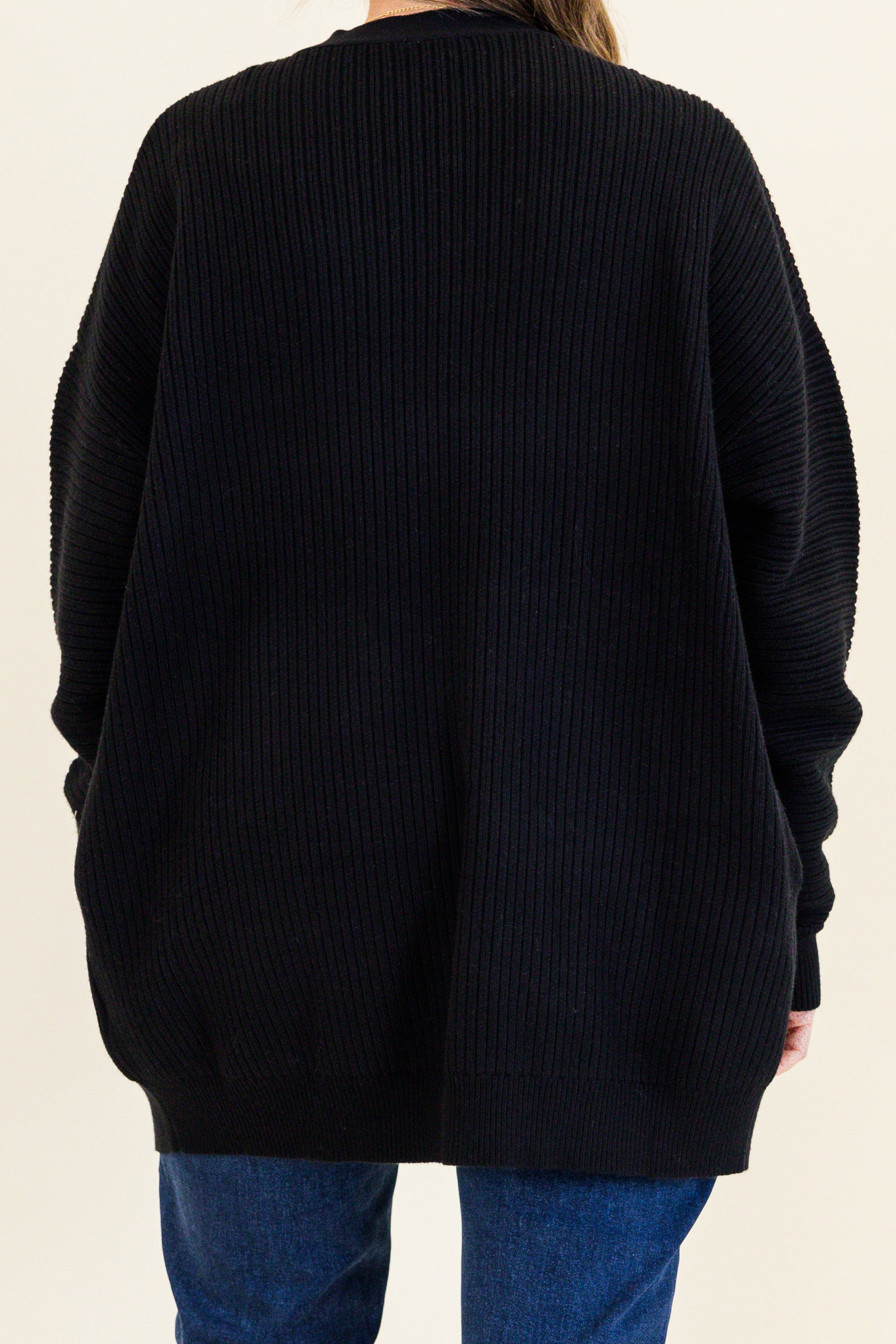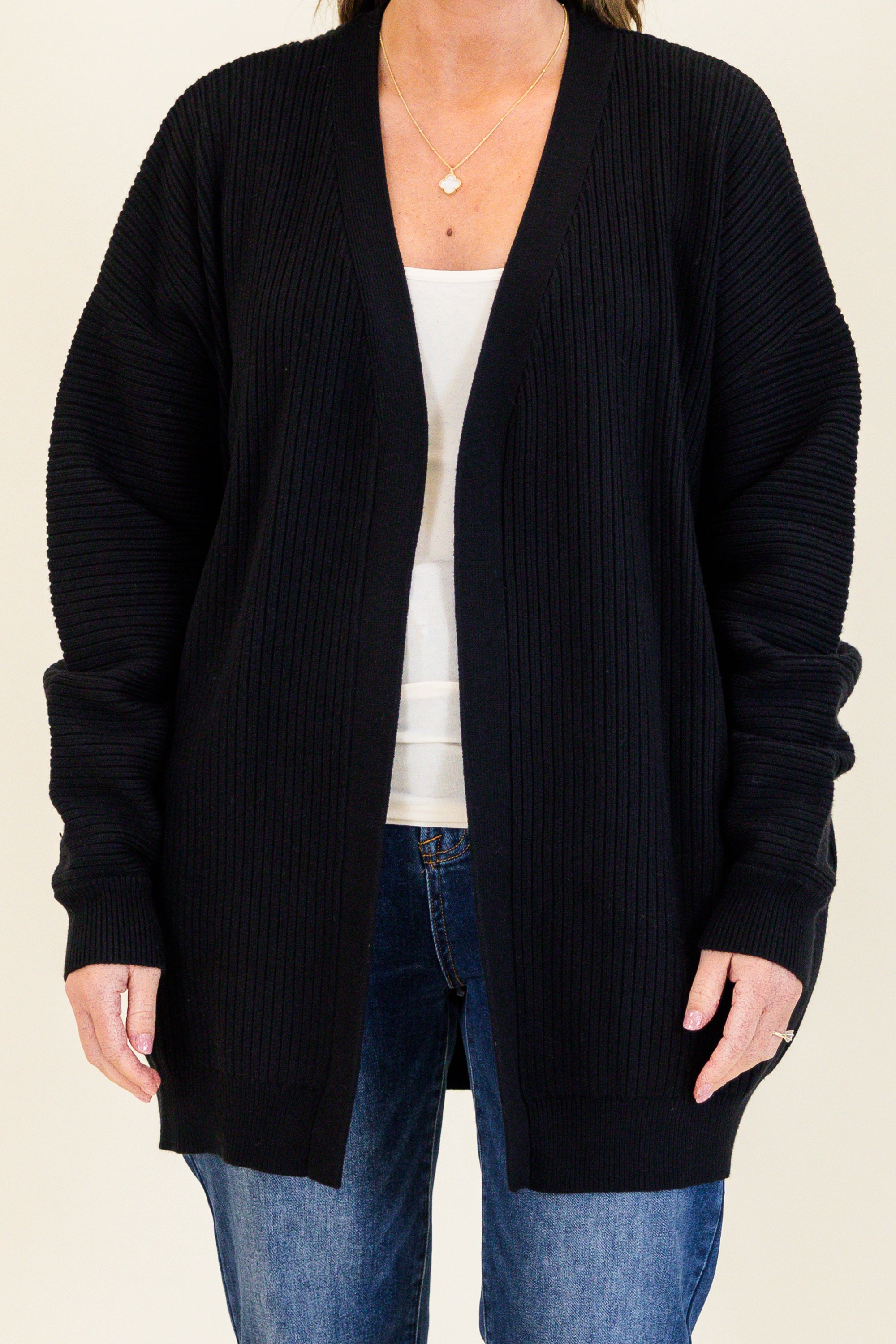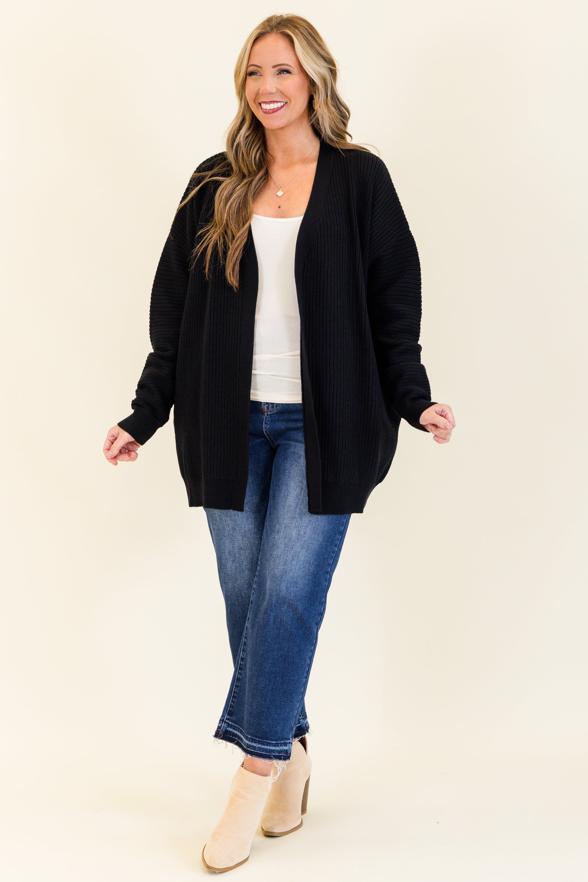 Elevate your wardrobe with our What You Imagine Cardigan in black! This ribbed knitted cardigan offers a versatile and stylish addition to any outfit! Crafted with a relaxed design, it provides both comfort and versatility! Stay warm and chic with this classic staple!