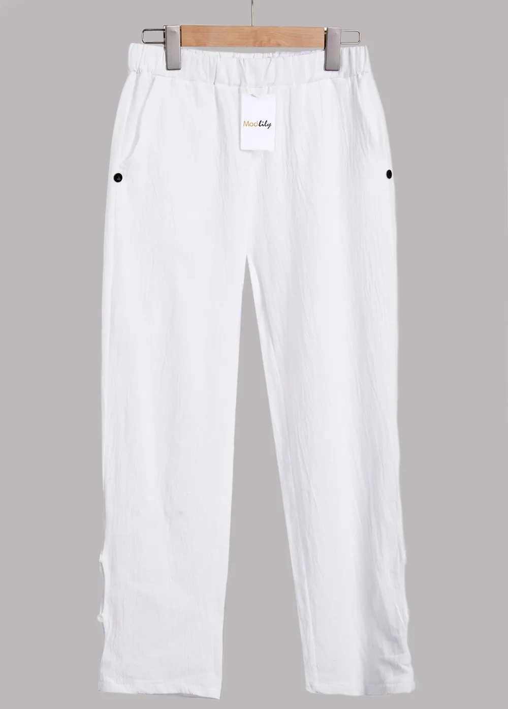 White Button Elastic Waist High Waisted Pants