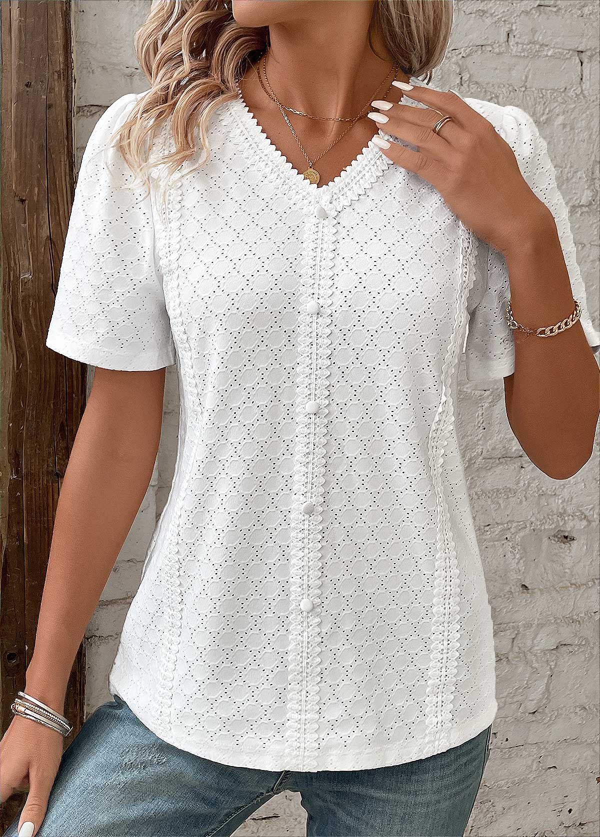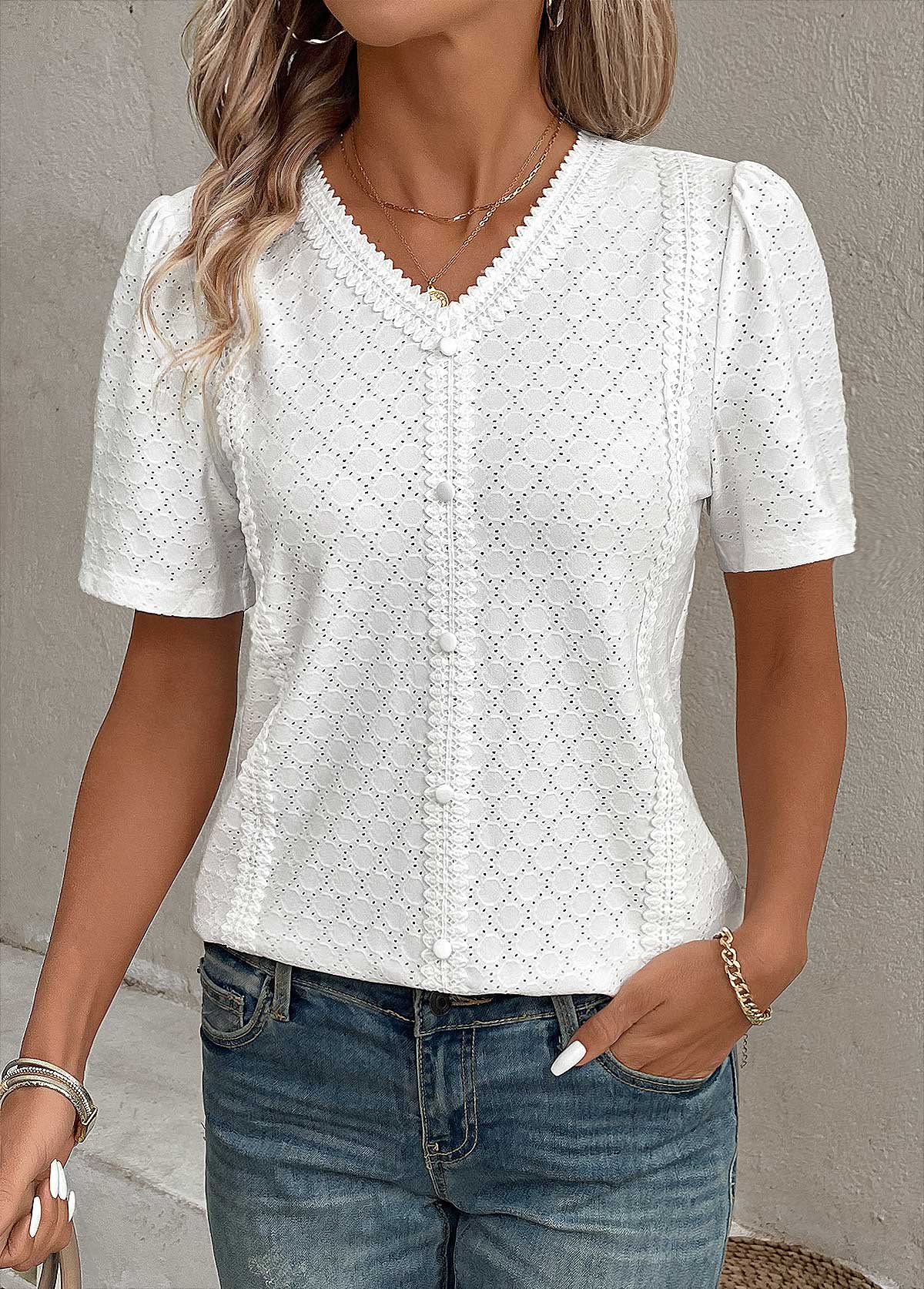 White Patchwork Short Sleeve V Neck Blouse