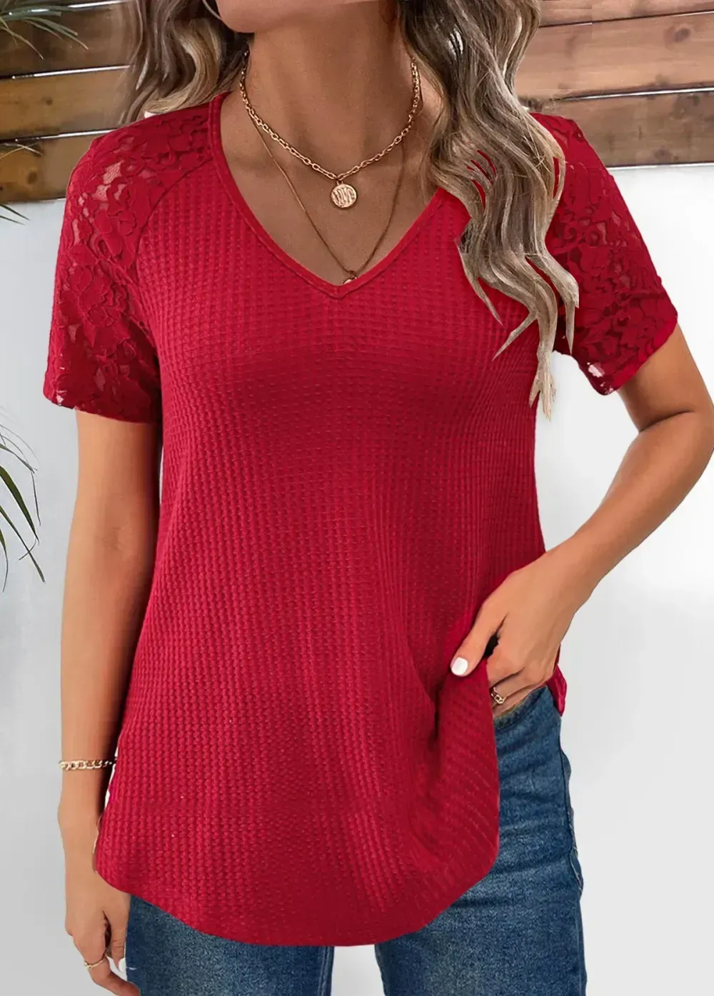 Wine Red Lace Short Sleeve V Neck T Shirt