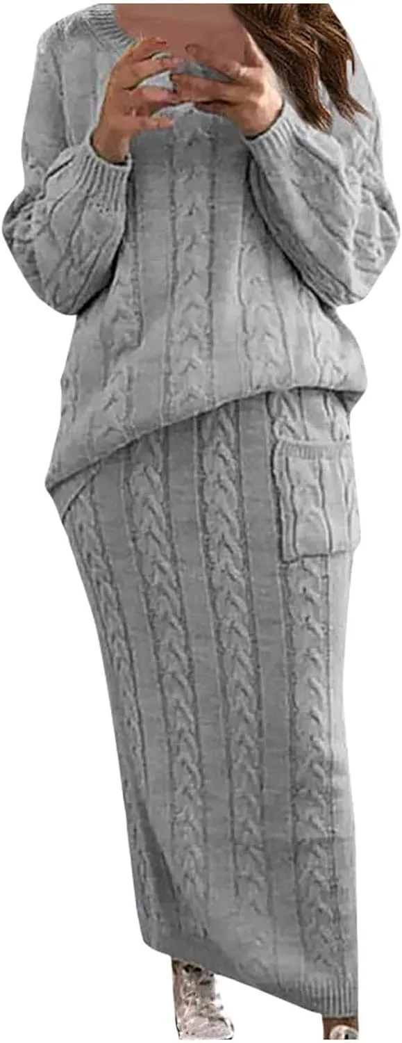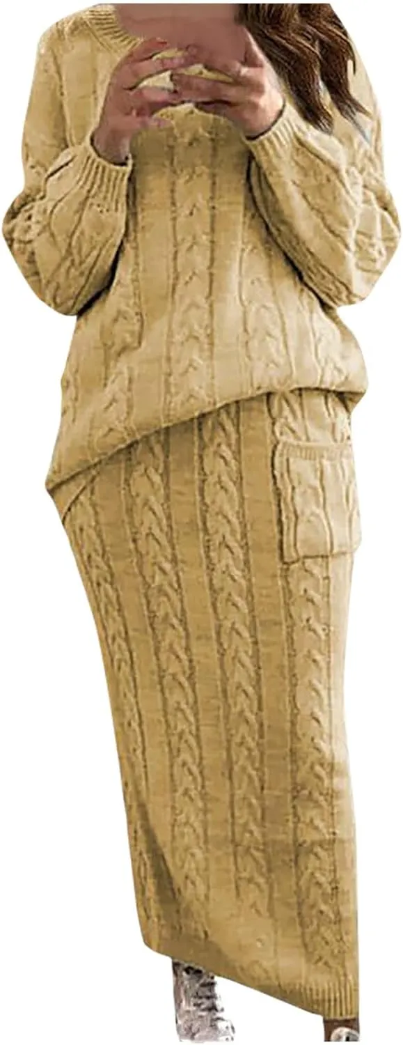 Women 2 Piece Outfits Knitted Sweater Tops and Long Skirt Turtleneck Long Sleeve Bodycon Dress Set Chunky Cable Knit
