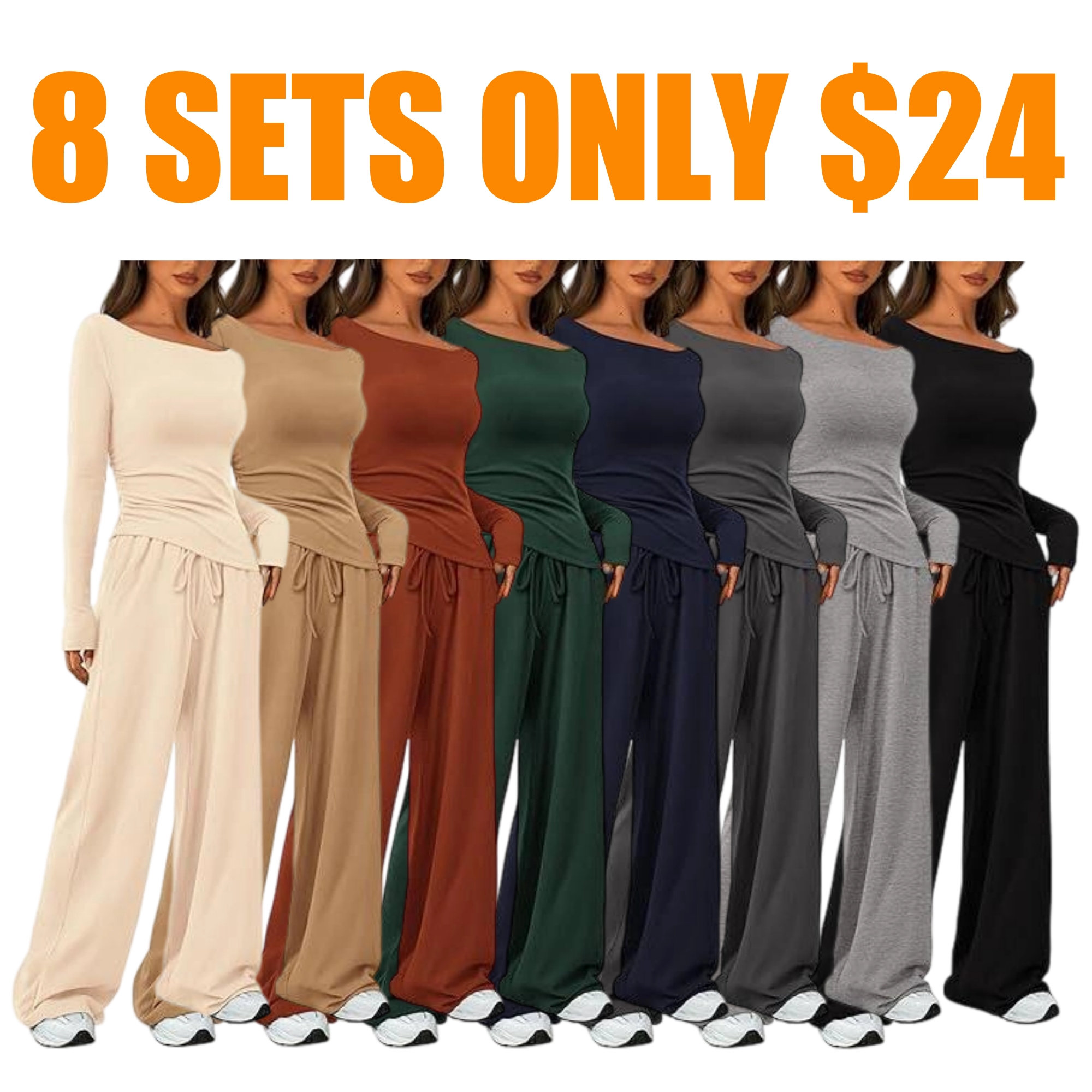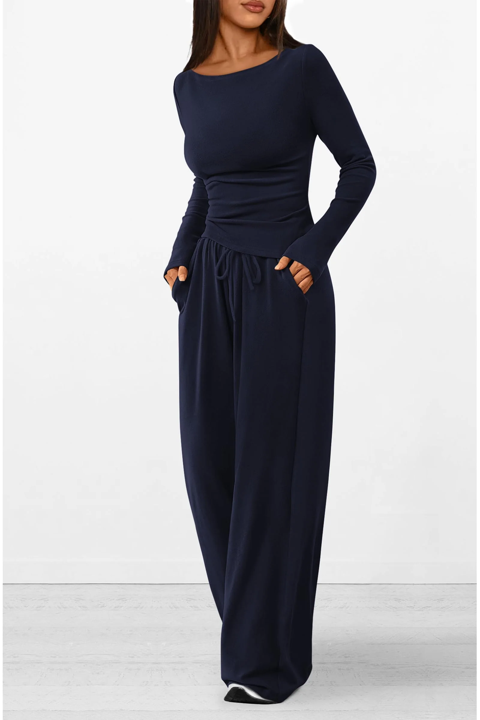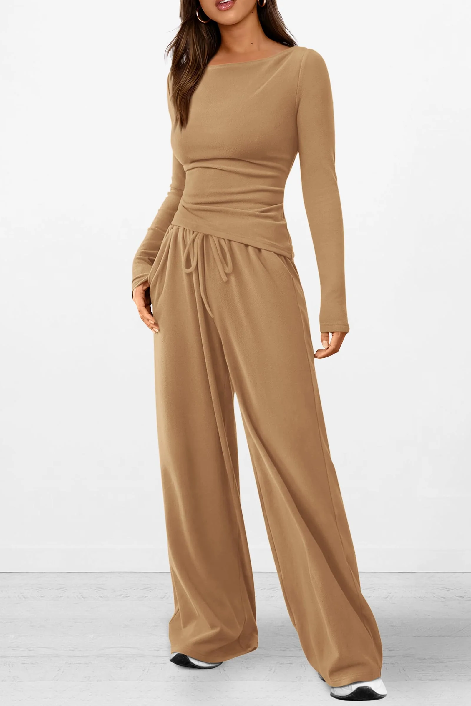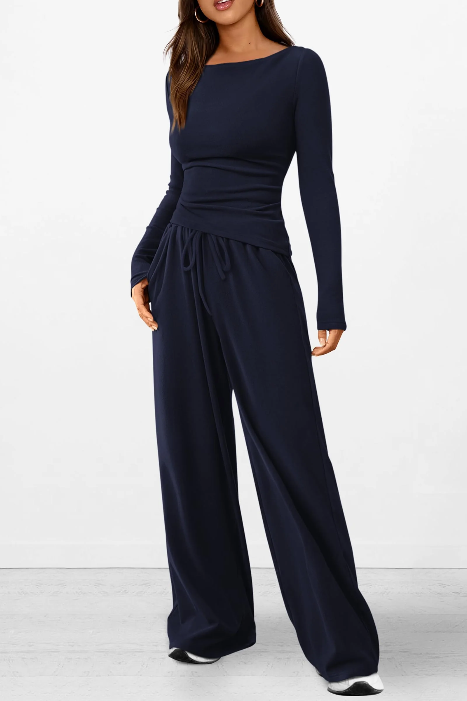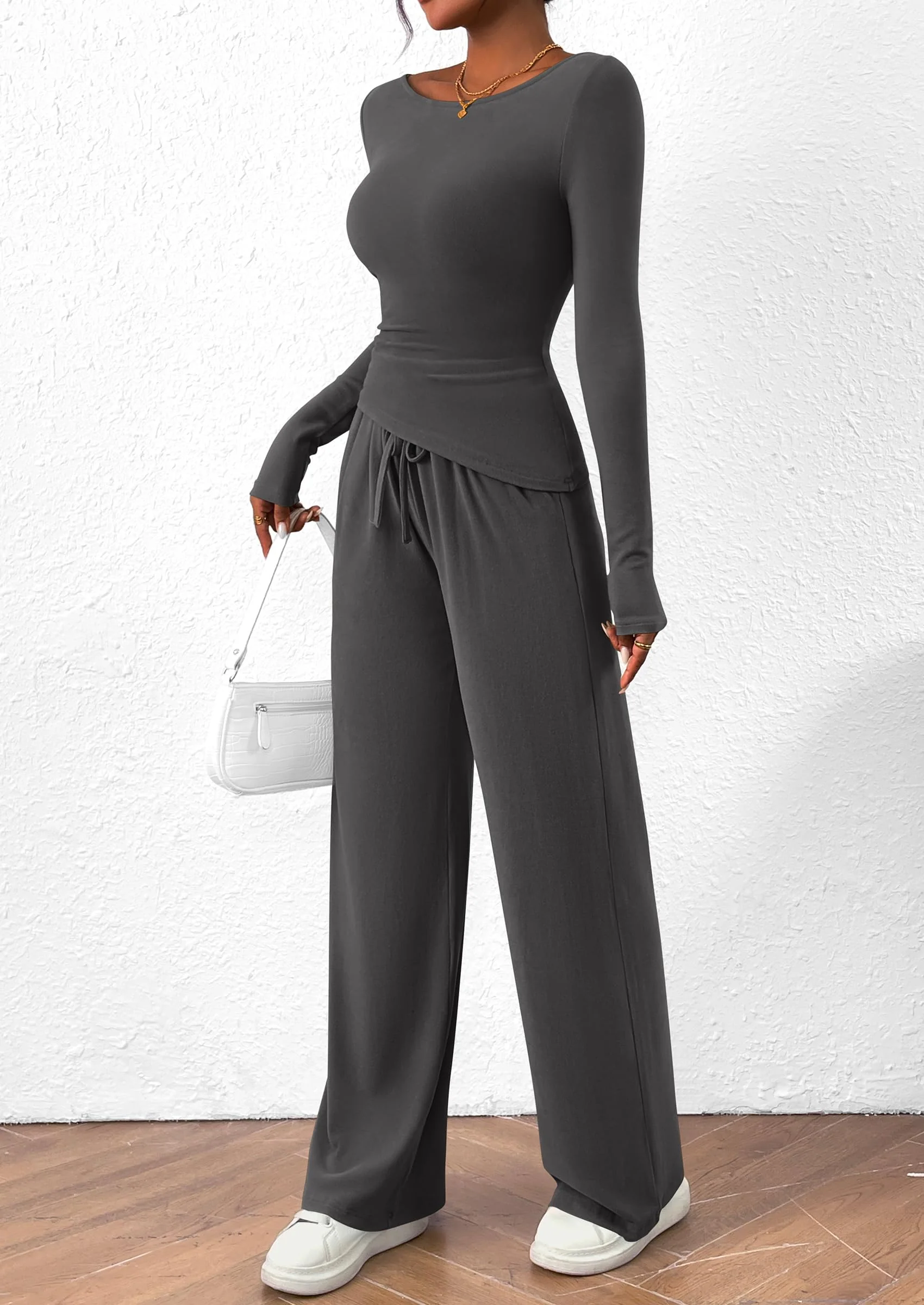 • Trendy Two Piece Set: Long Sleeve Two Piece Outfits/ Womens Fall Clothes/ Fitted Shirts for Women/ Ruched Tops/ Asymmetrical Tops for Women/ Off the Shoulder Top/ Wide Leg Pants/ High Waisted Sweatpants/ Pants with Pockets/ Y2K Outfit Sets/ Matching Sets