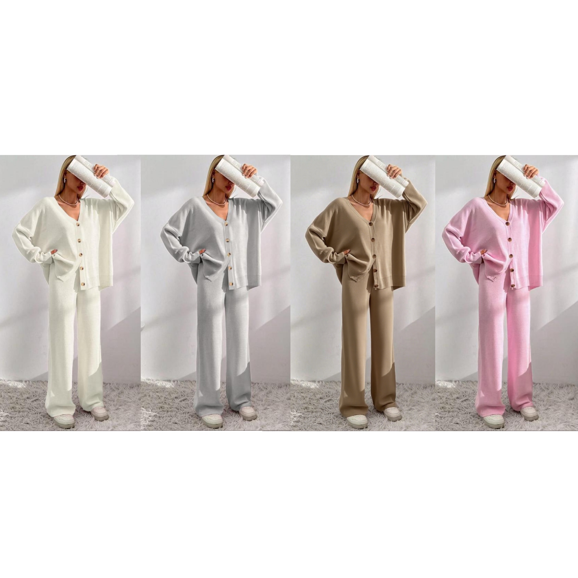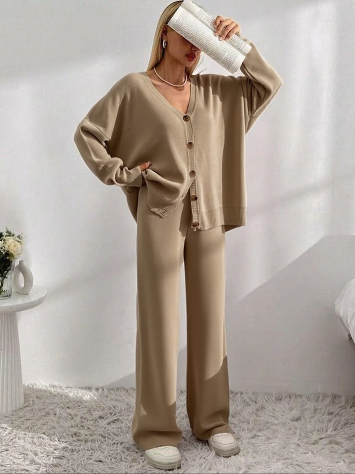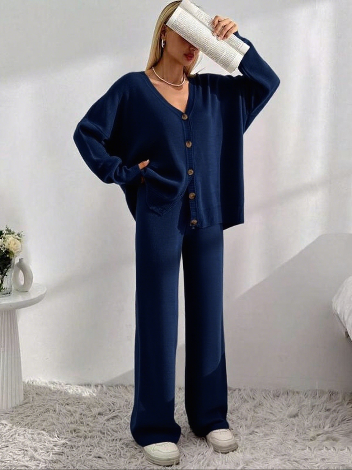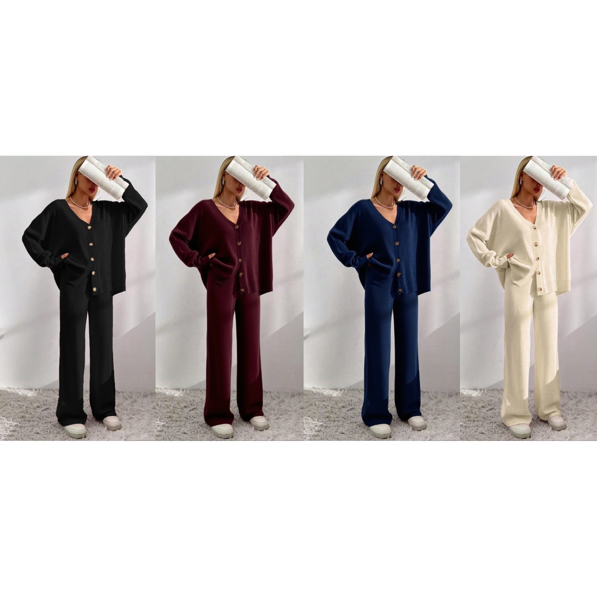 Set Design: Women's 2-piece knit set—V-neck button-front drop shoulder cardigan + elastic waist wide leg pants.