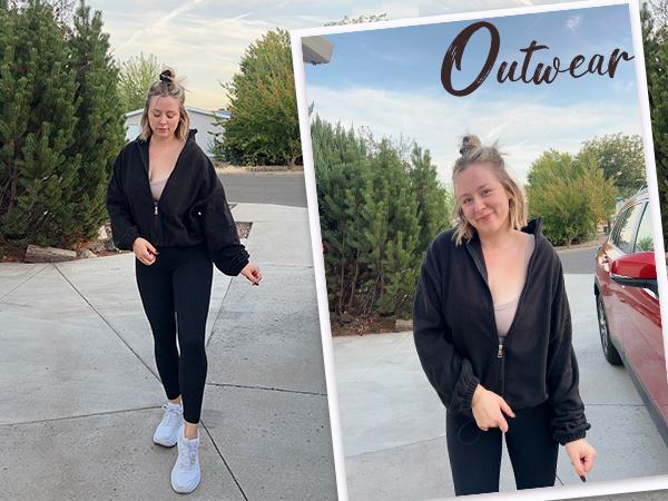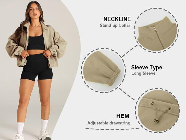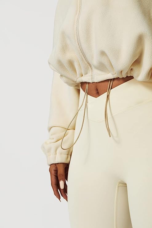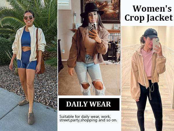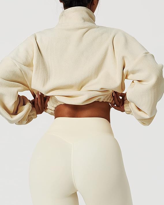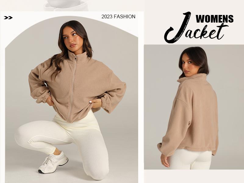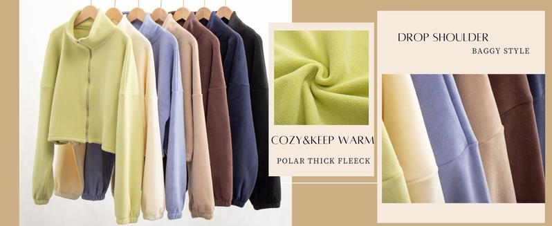 MATERIAL: 95% Polyester, 5% Spandex,Super soft touch feeling polar fleece brings both warmth and cozy in temperatures above 32¨H degrees,this highly polar fleece jacket provides comfort after sweating or daily fashion. Easy to care for and easy to wear, you'll love the effortless look and feel anywhere you go. The Features: Featuring a 20"(shoulder to hem measured size s) short jacket design, Full zip up and stand collar,bungee at hem and keep the cold out,Baggy,Cropped length,Perfect winter outfit for your jeans, legging, or any pants.