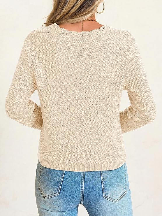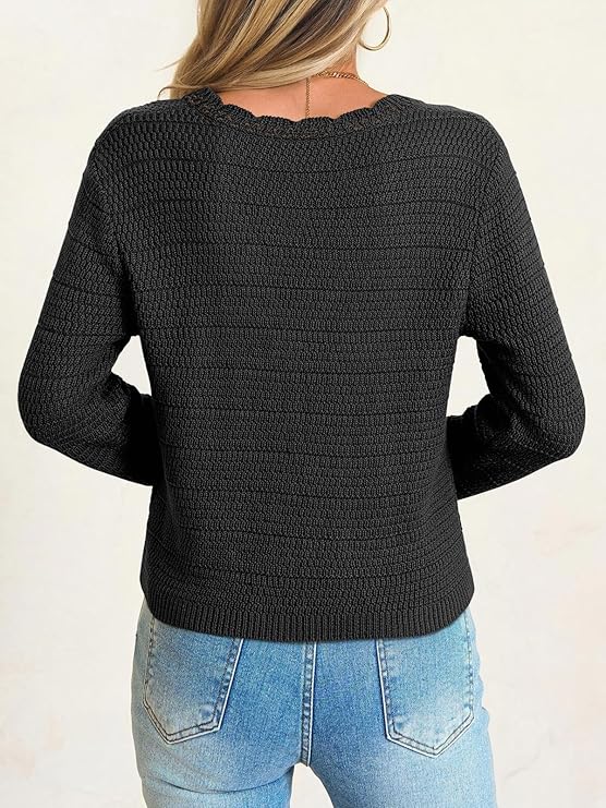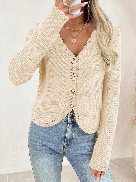 Key Features: V-neck cropped cardigan—button-down, solid color, casual loose fit, long sleeve, front slit; crochet knit placket/hem (boho vibe).