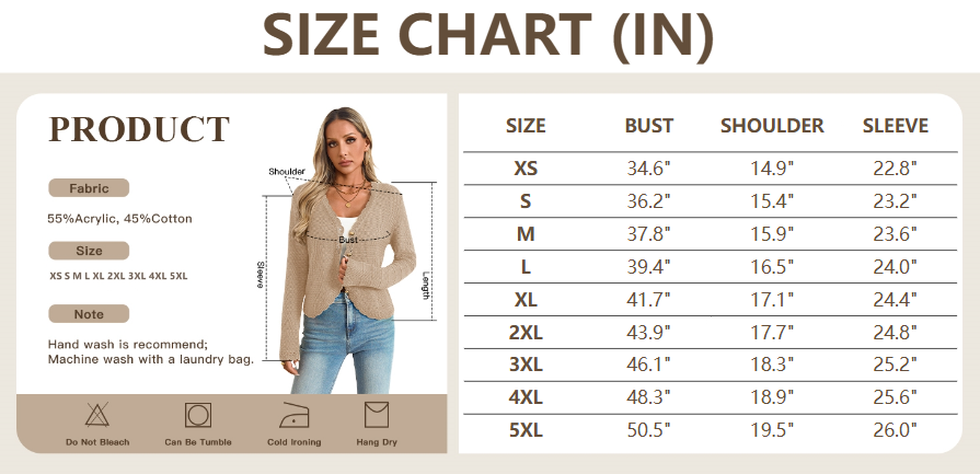 Fabric & Care: 55% Acrylic, 45% Cotton knit—soft, breathable, lightweight. Machine washable; ideal for layering (style + comfort).