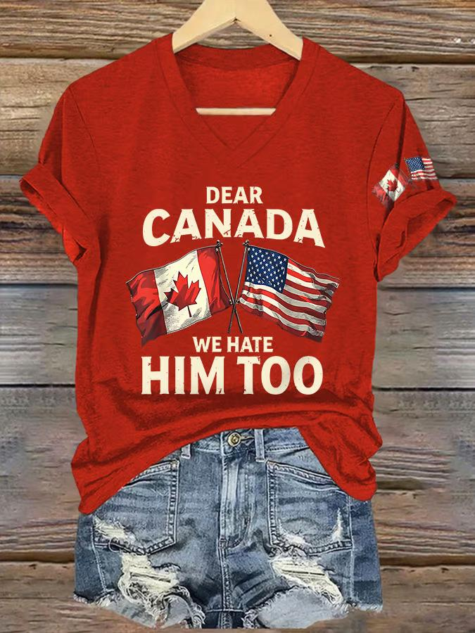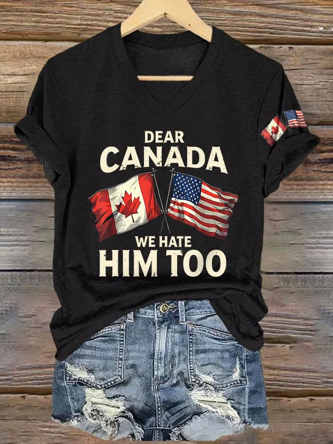 Women's V-Neck Retro Dear Canada We Hate Him Too Print T-Shirt