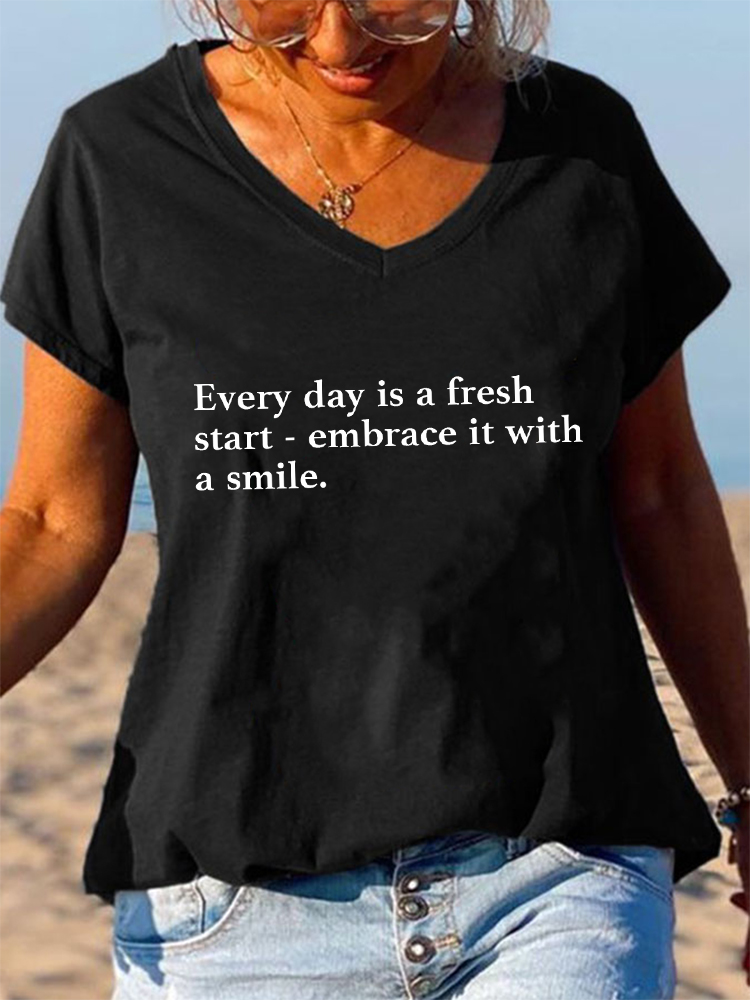 Women'S V-Neck Short-Sleeved T-Shirt Every Day Is A Fresh Start -Embrace It With A Smile Prints
