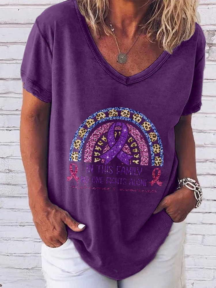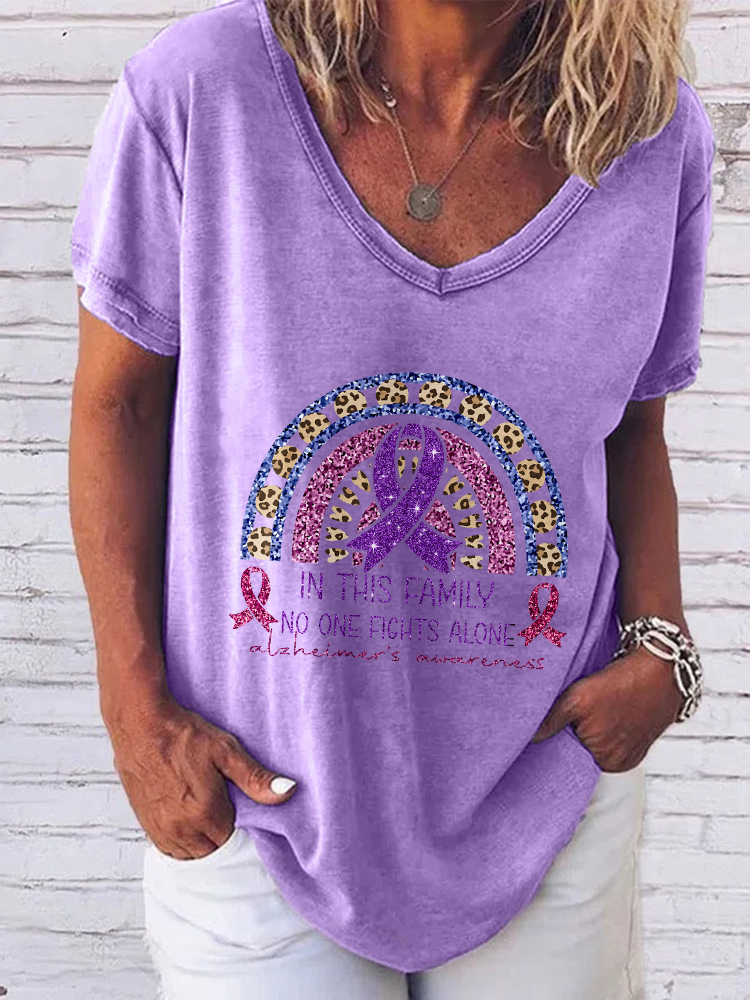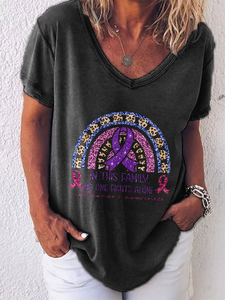 Women'S V-Neck Short-Sleeved T-Shirt In This Family No One Fights Alone Alzheimer'S Awareness Prints