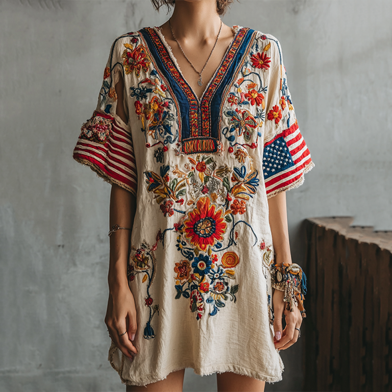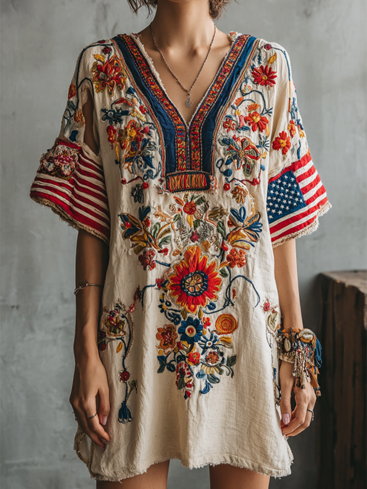 Women's Boho Independence Day Flag Floral Art V Neck Casual Midi Dress