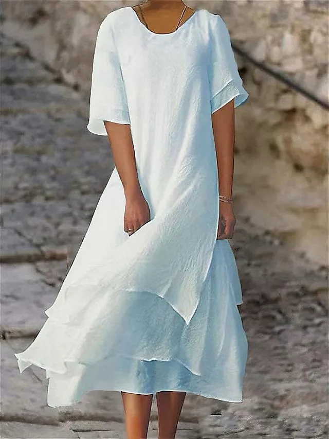 Women's Casual Dress Cotton Linen Dress White Cotton Dress Midi Dress Layered Basic Daily Crew Neck Half Sleeve Summer Spring White Yellow Plain