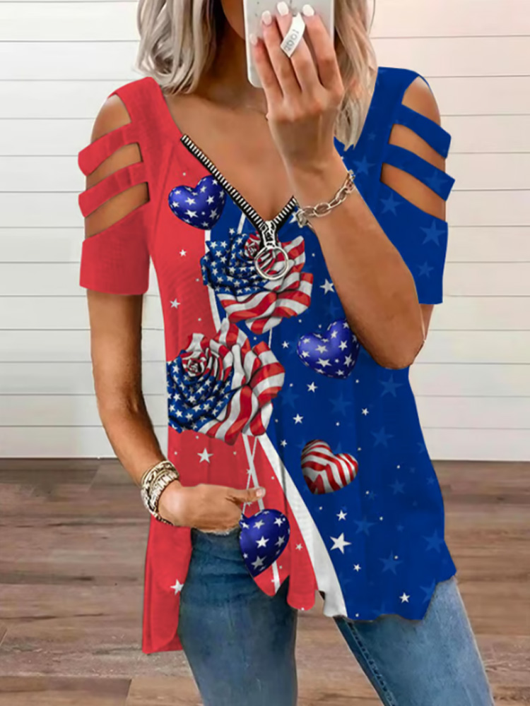 Women's Casual Independence Day Love Heart Zipper Hollow Top
