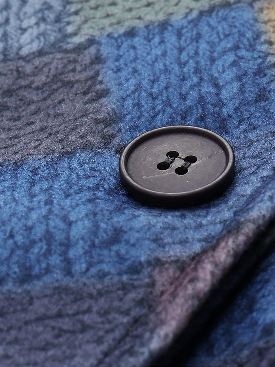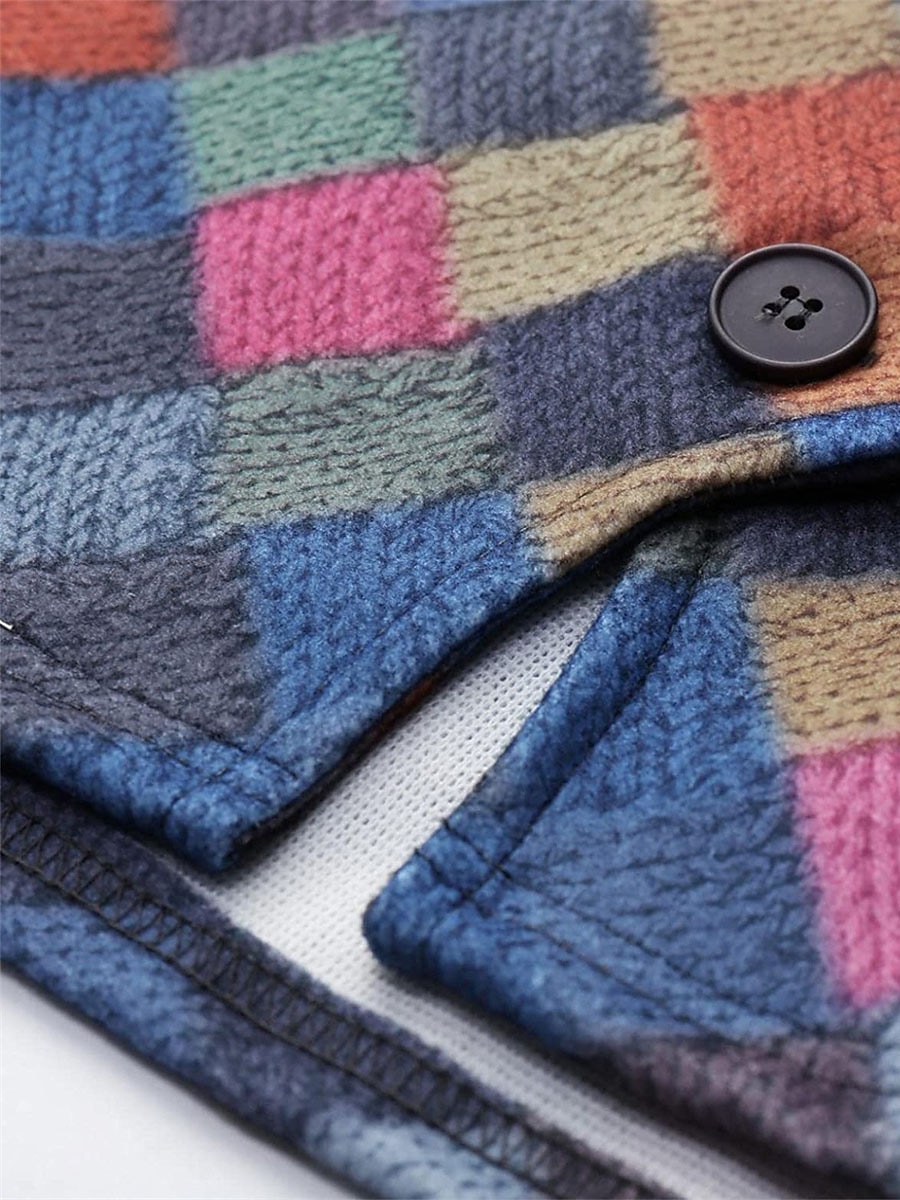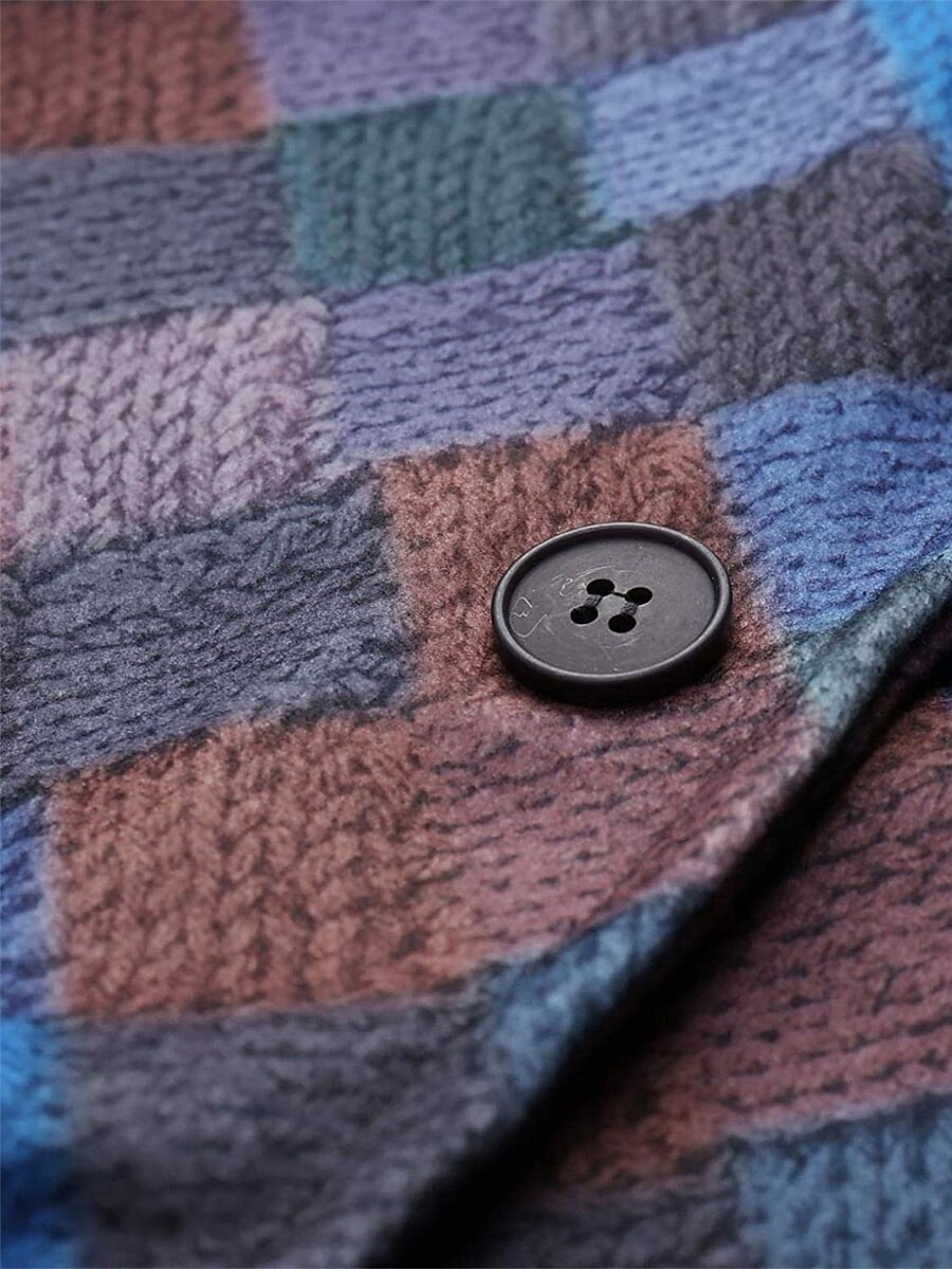 [Design Details:] The cardigan boasts a captivating colorblock print with stripes and plaid patterns in shades of blue, red, pink, green, and brown, creating a lively and eclectic appearance. The V-neckline further enhances its stylish appeal, offering a touch of sophistication.