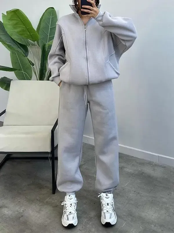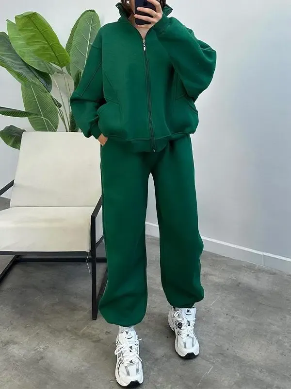 Women's Casual Lapel Solid Color Zipper Two-piece Suit