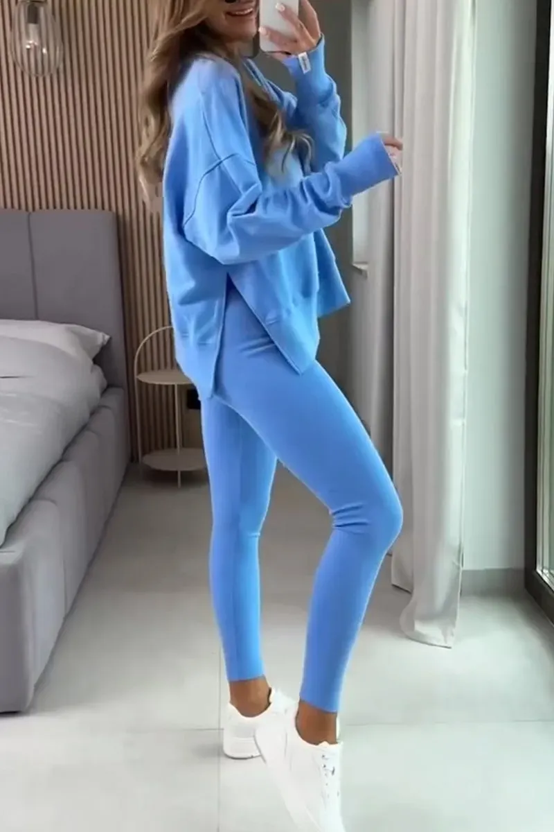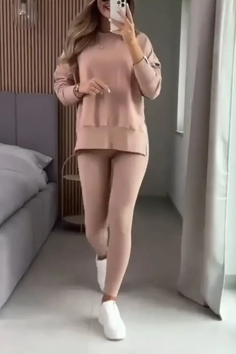 Women's Casual Round Neck Solid Color Side Opening Two Piece Suit