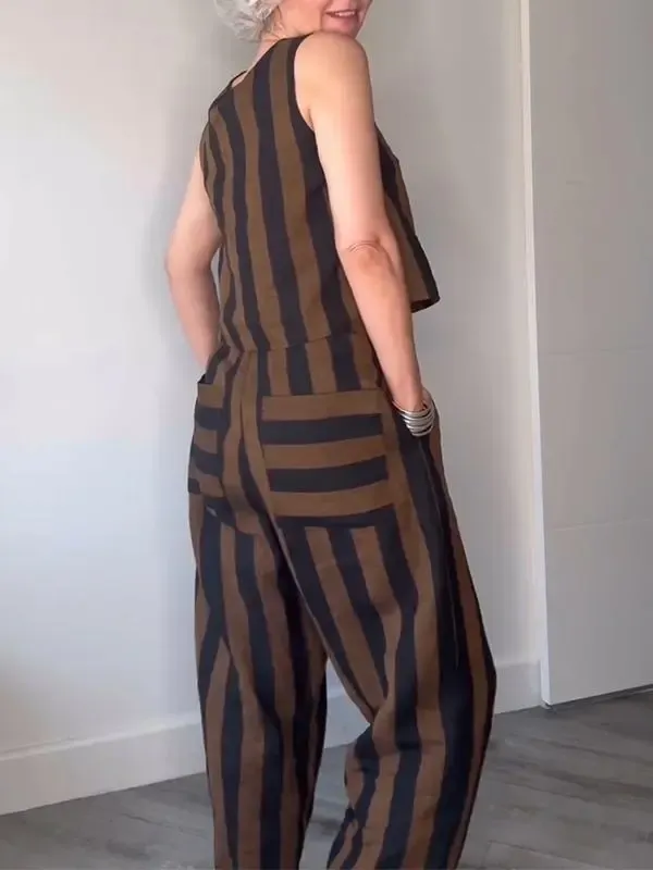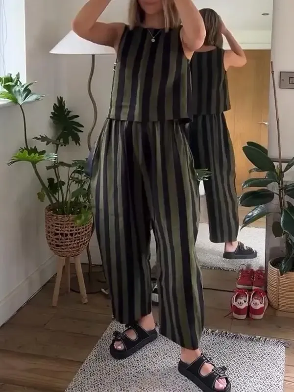 Women's Casual Round-neck Striped Sleeveless Two-piece Suit