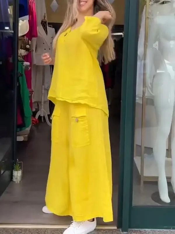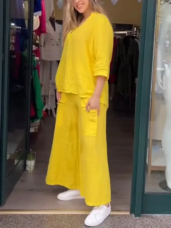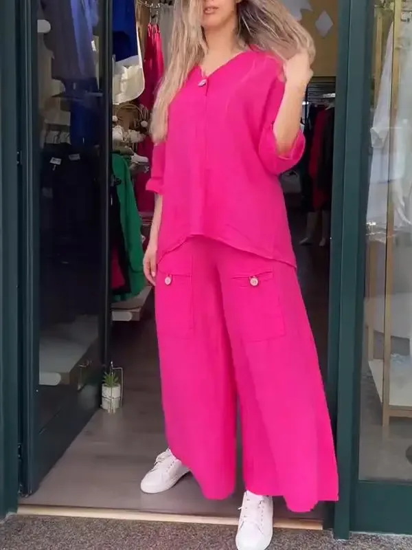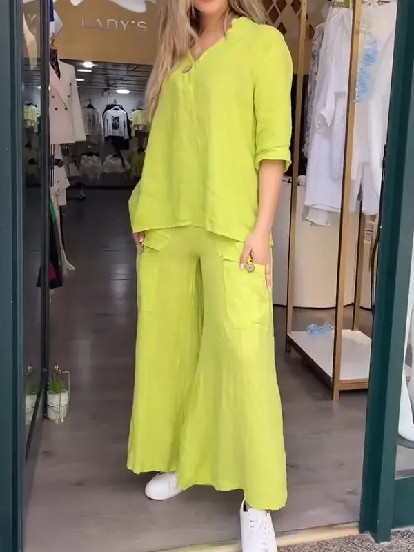 Women's Casual V-neck Solid Color Cotton and Linen Two-piece Suit