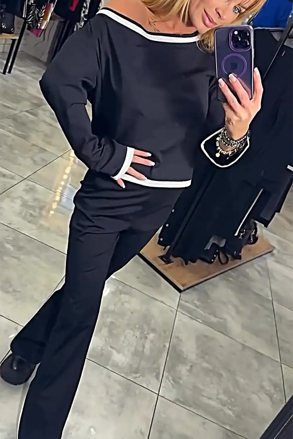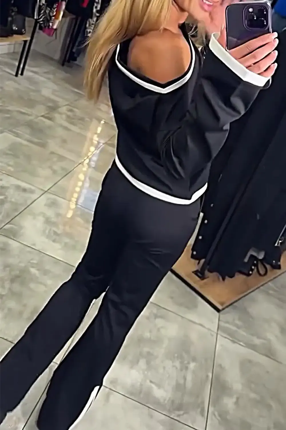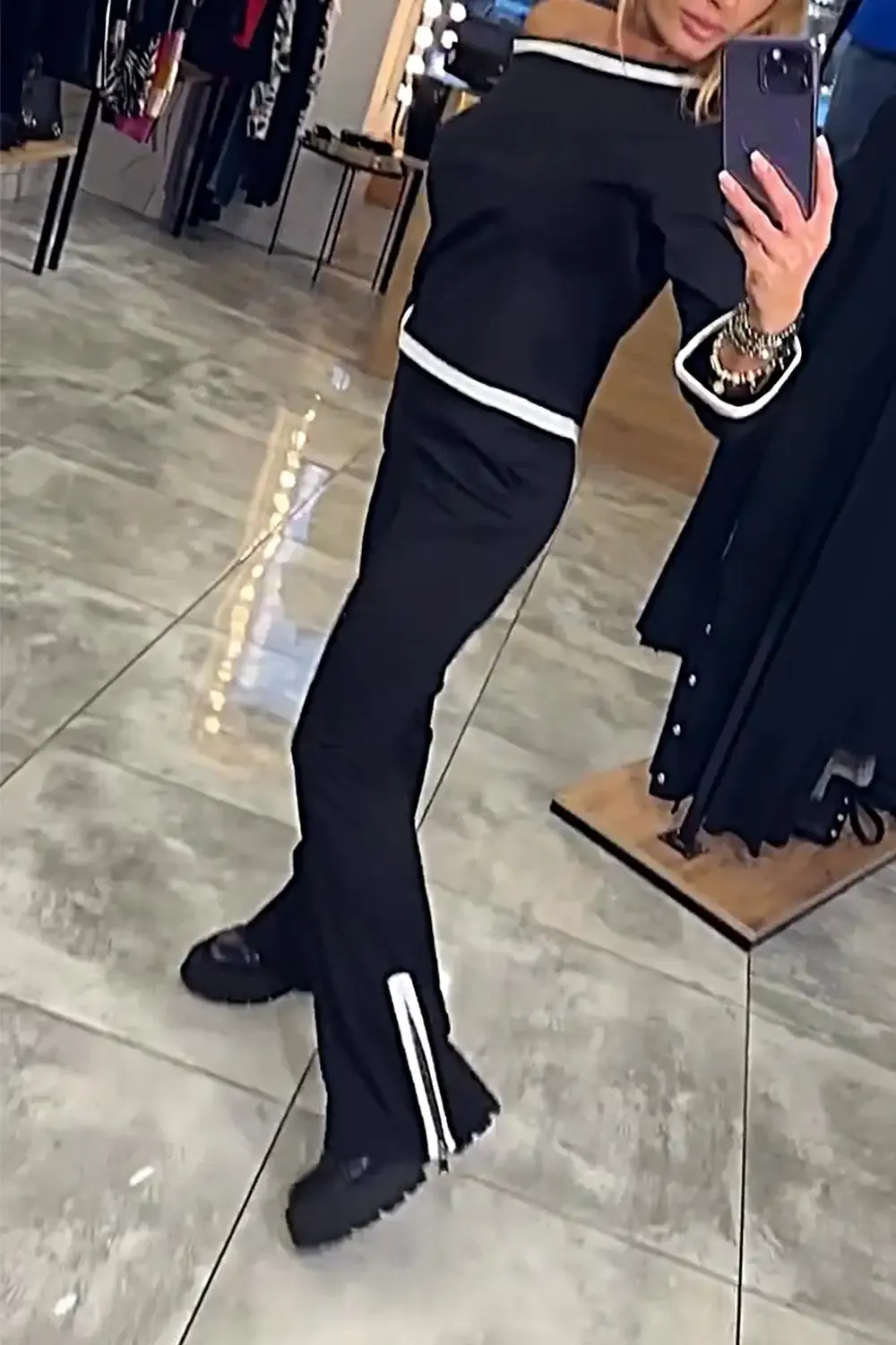 Women's Contrasting Color Off-shoulder Top & Slit Trousers Two-piece Set